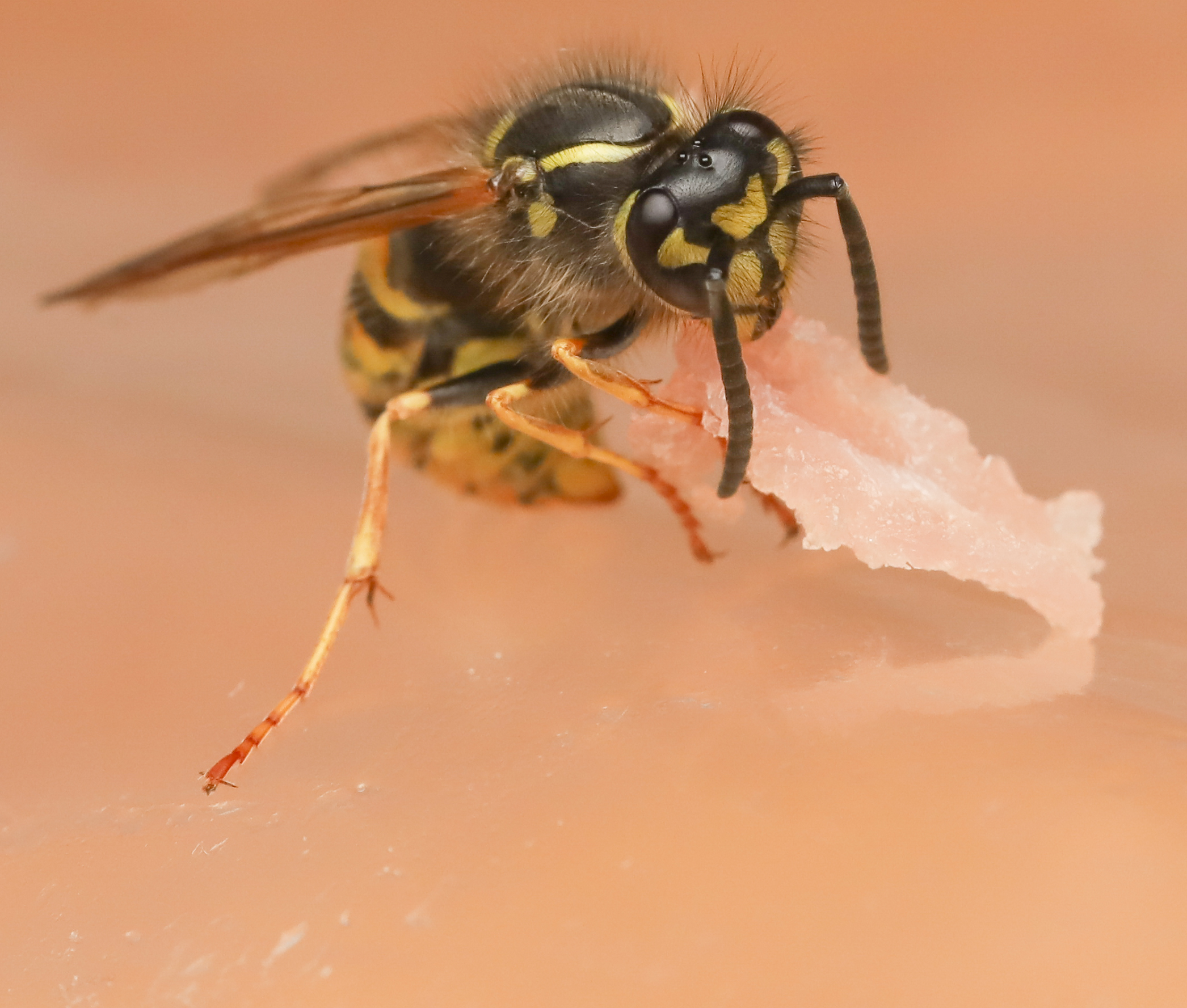 Gemeine Wespe (Vespula vulgaris) verspeist rohen Schinken.