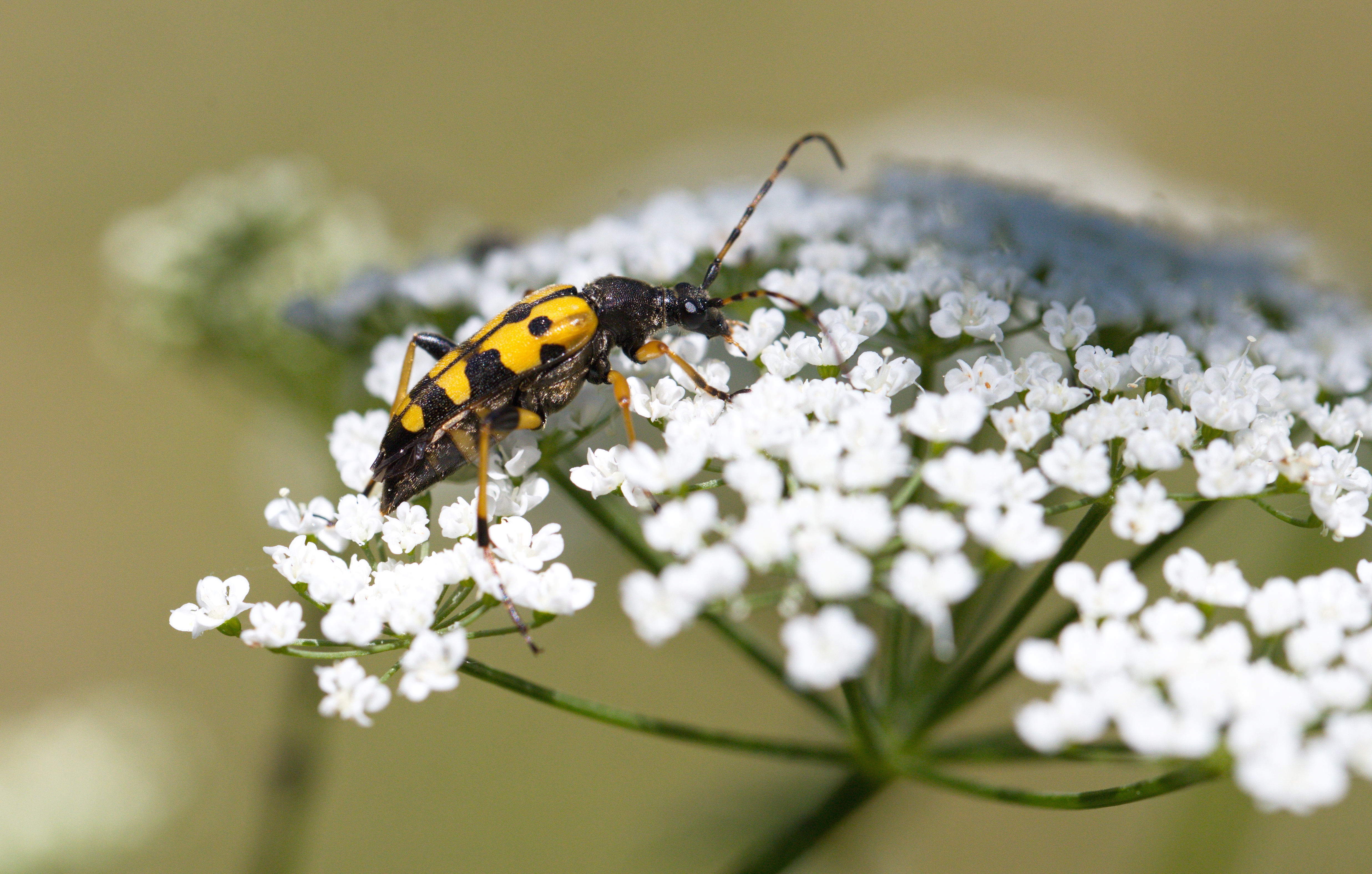 Gefleckter Schmalbock (Rutpela maculata) auf der Blüte einer Wilden Möhre.