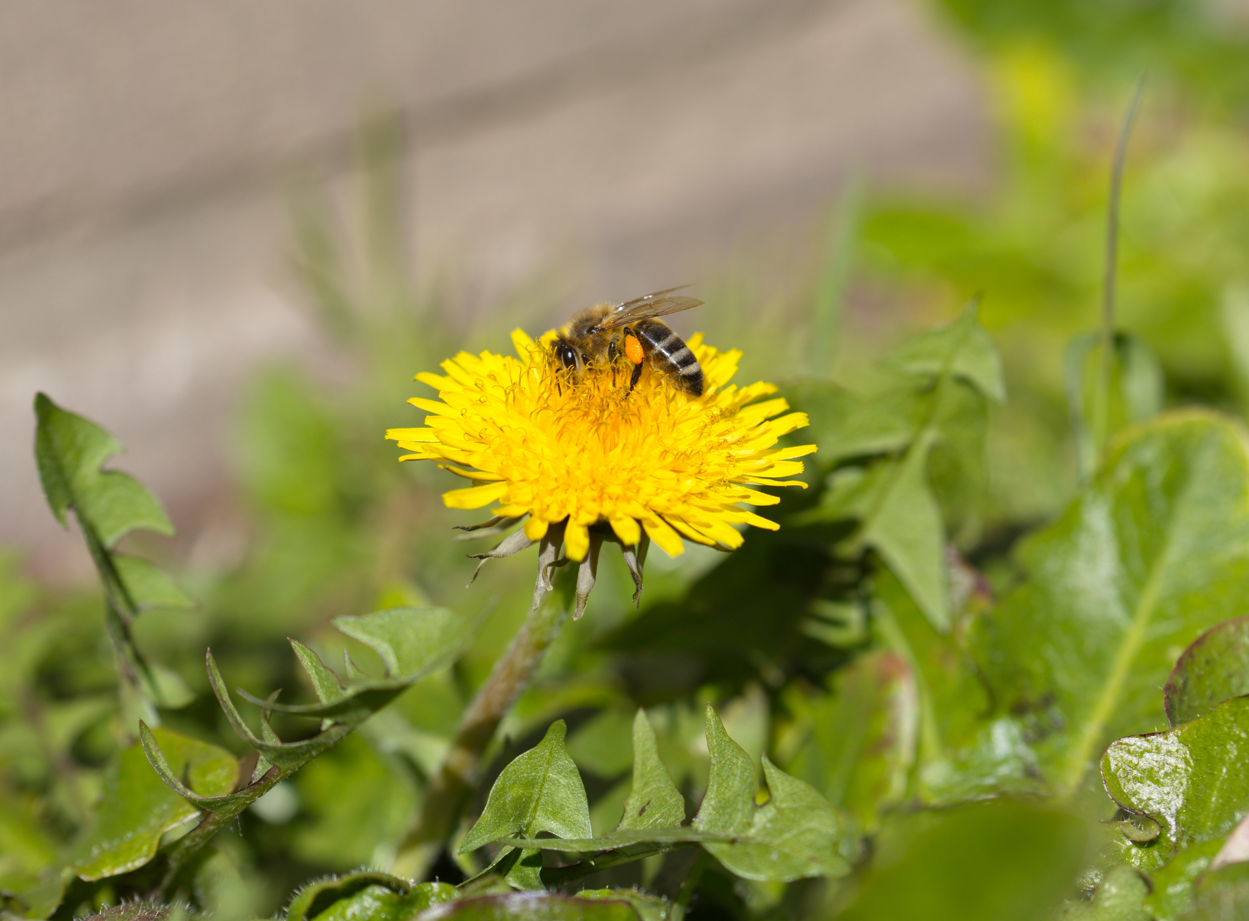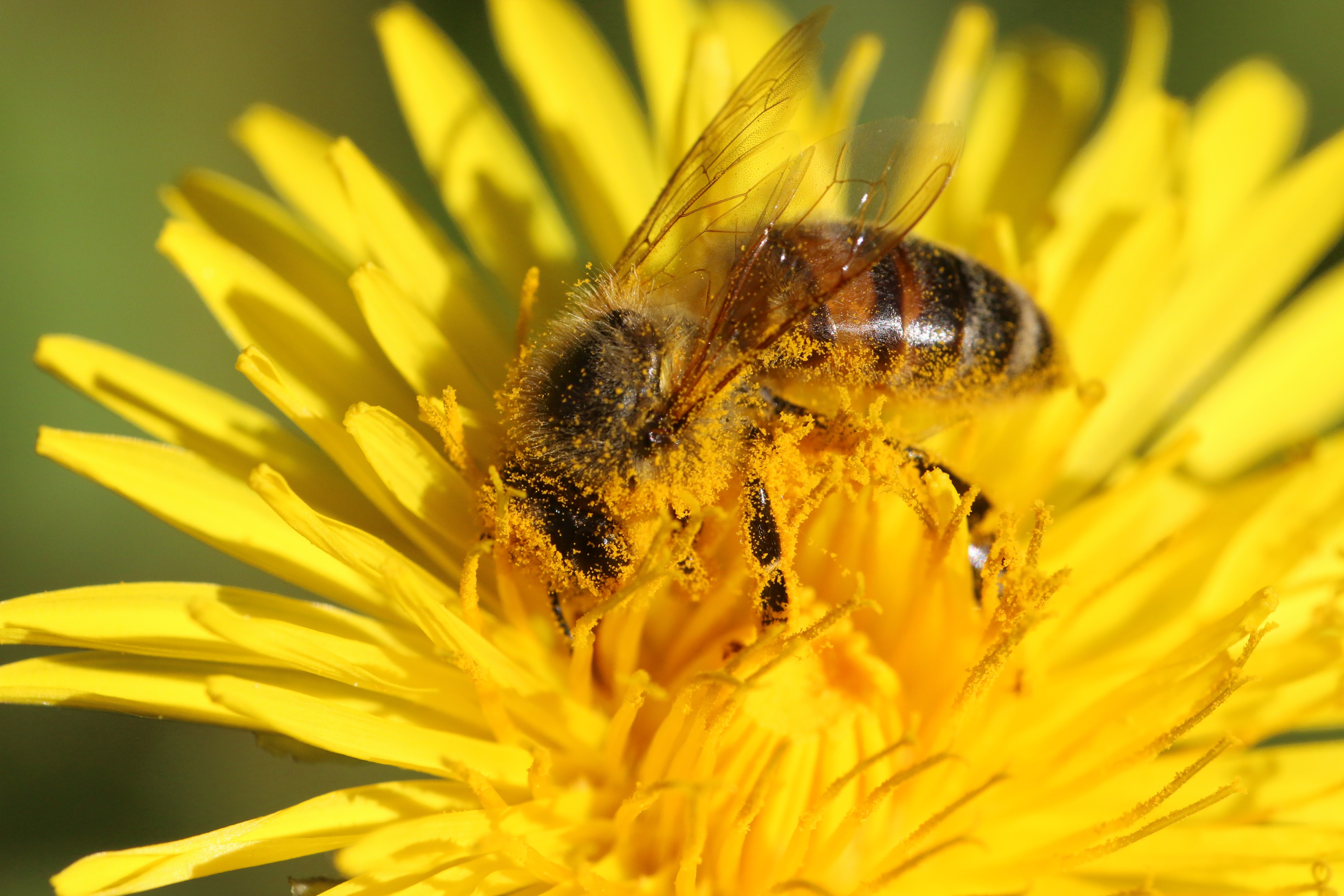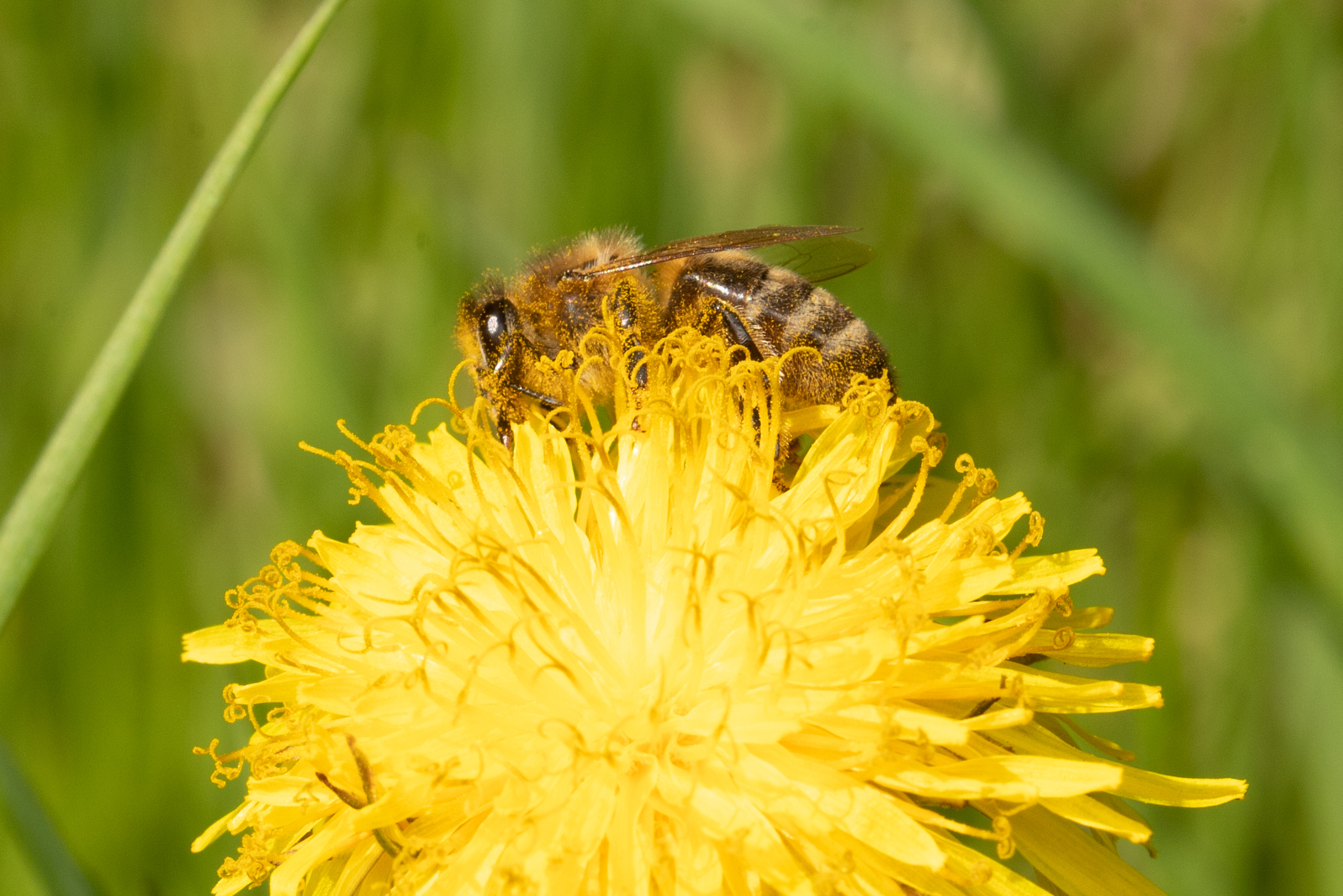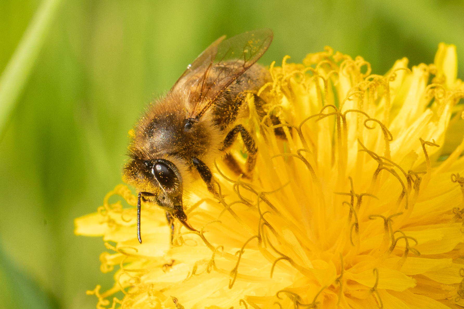 Westliche Honigbiene (Apis mellifera) mit gefüllten Pollentaschen auf einem Löwenzahn.