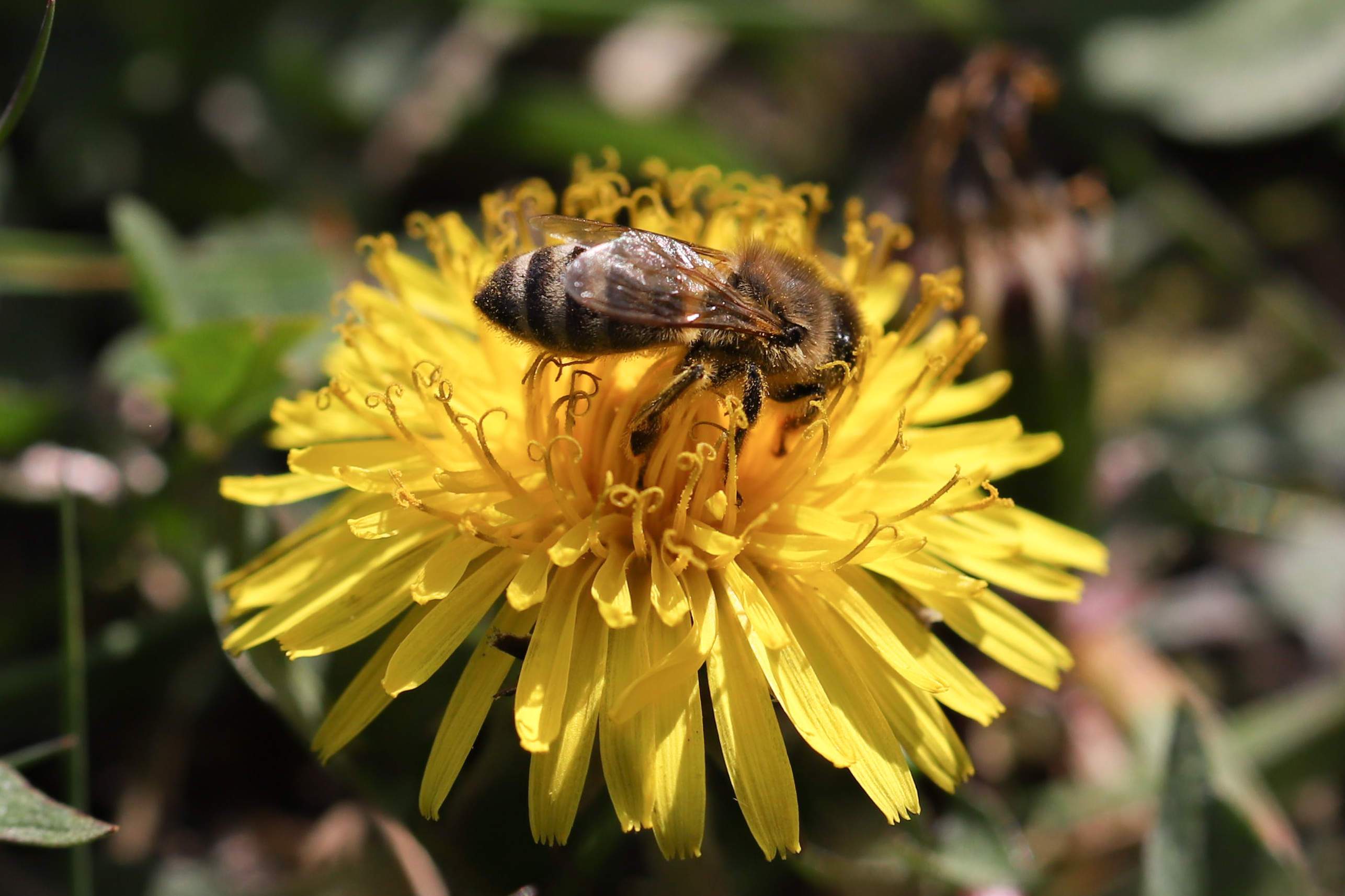 Westliche Honigbiene (Apis mellifera) auf einem Löwenzahn,