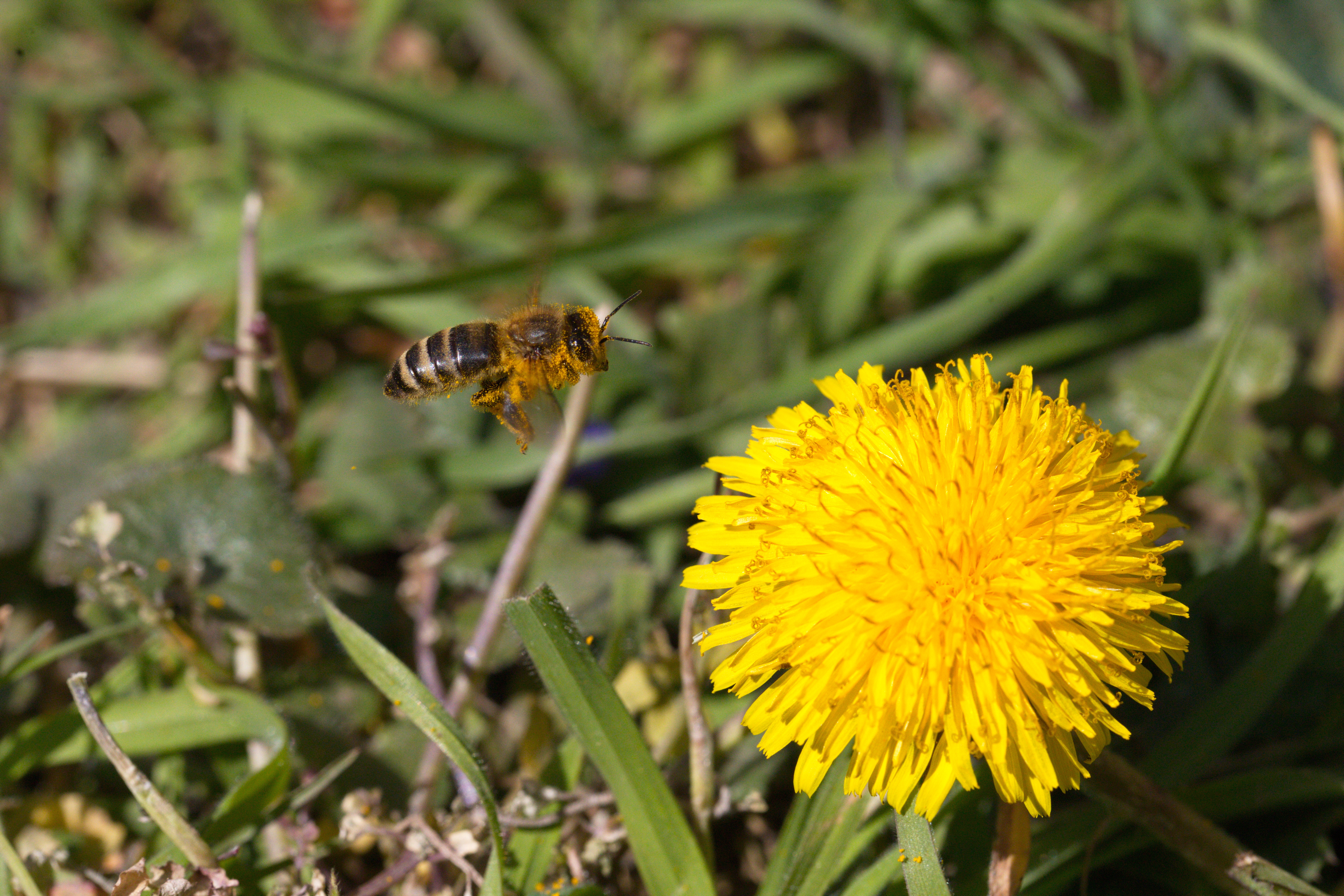 Westliche Honigbiene (Apis mellifera) im Anflug auf einen Löwenzahn.