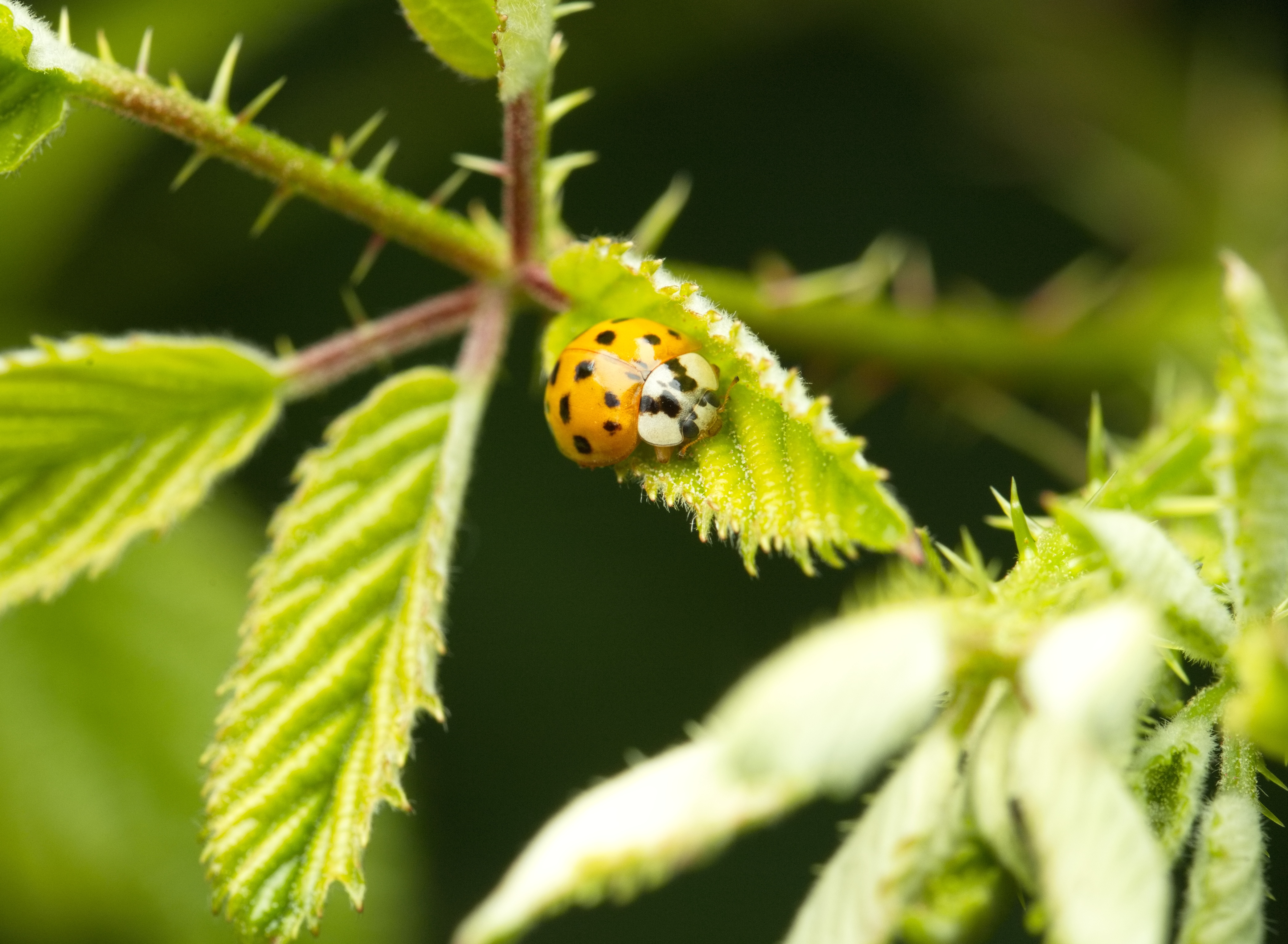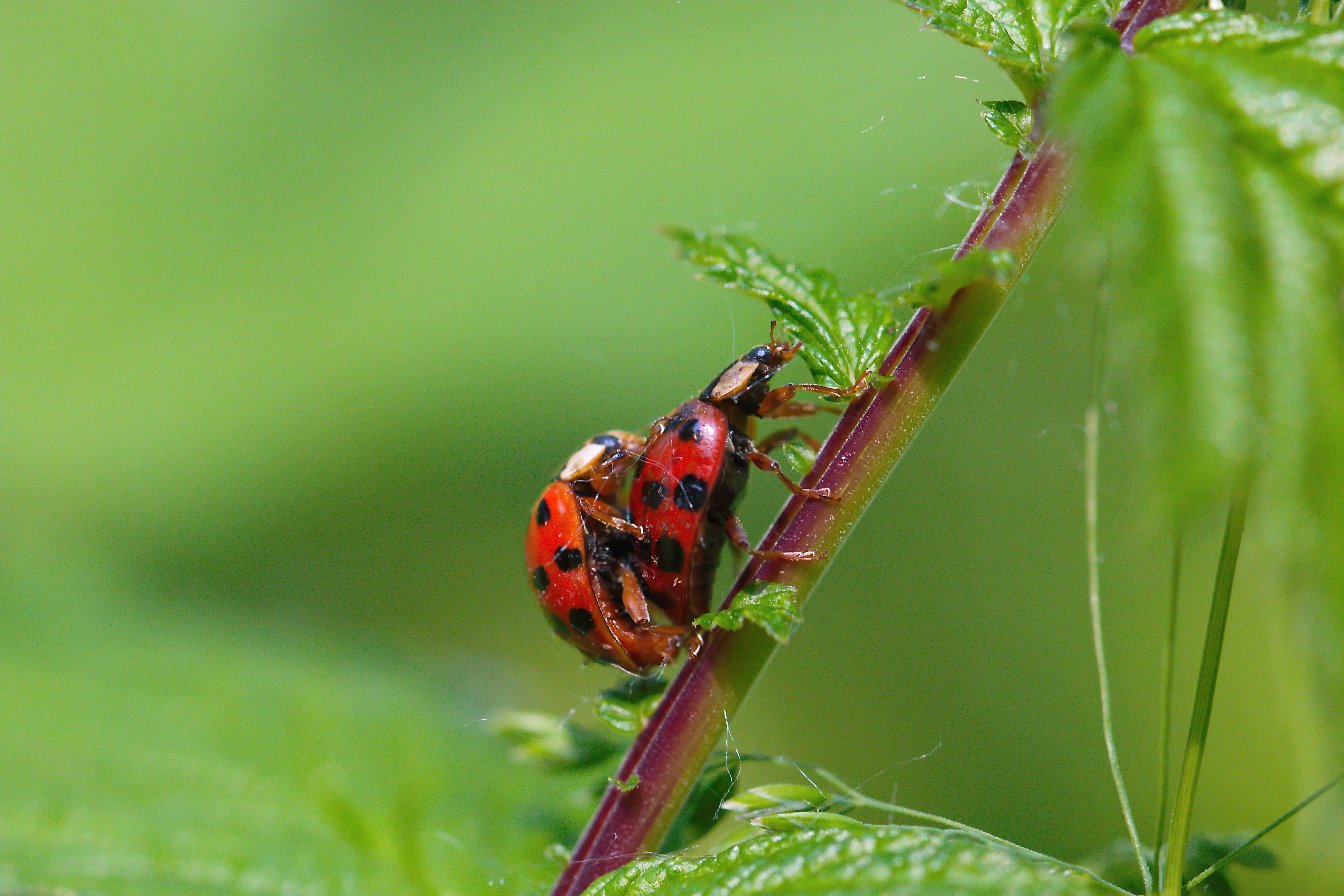 Dreizehnpunkt-Marienkäfer (Hippodamia tredecimpunctata) paaren sich auf einem Pflanzenstengel.