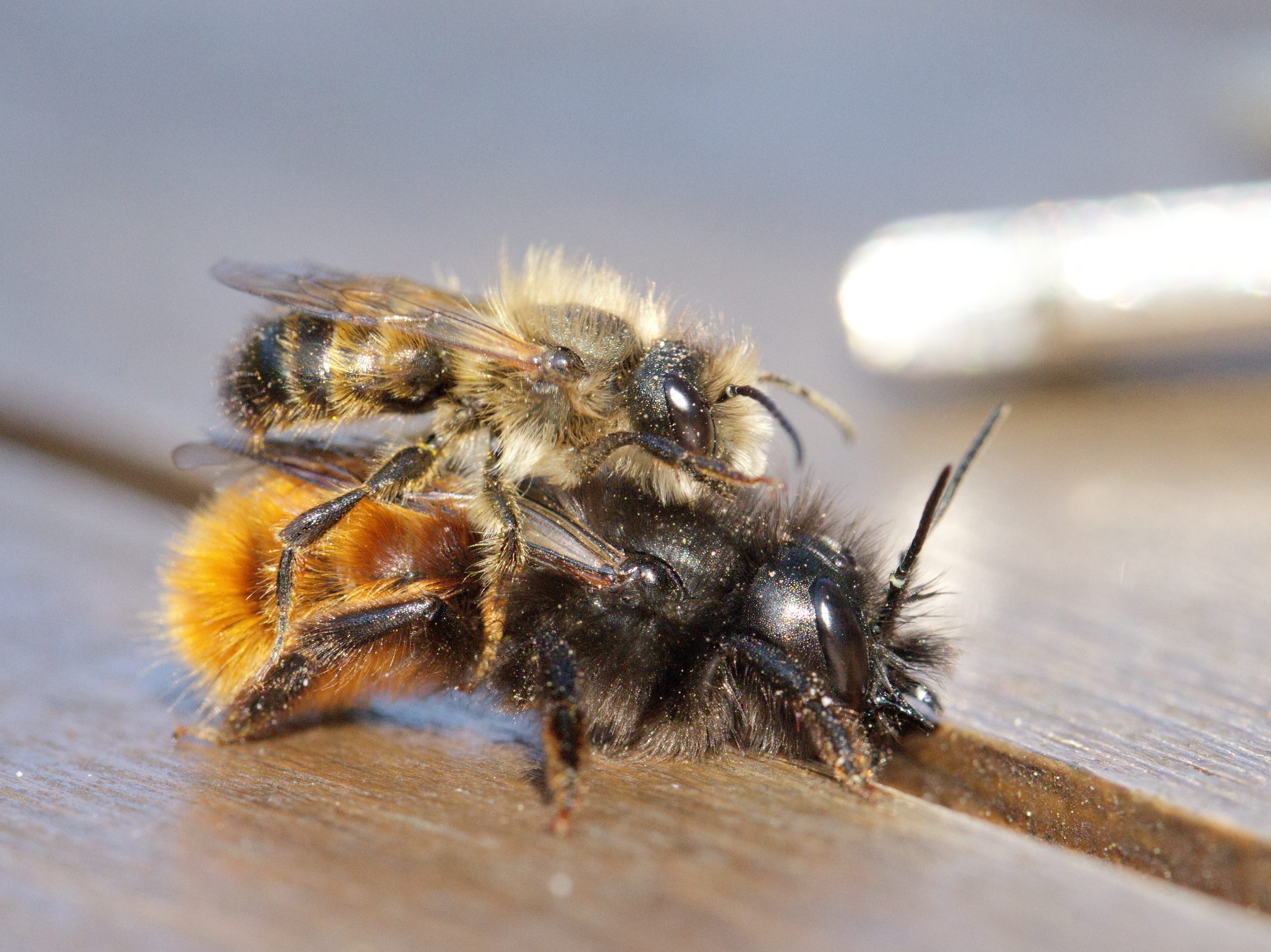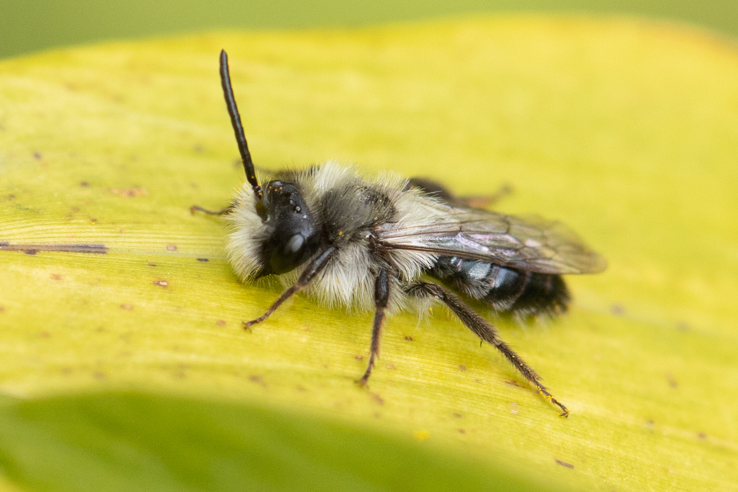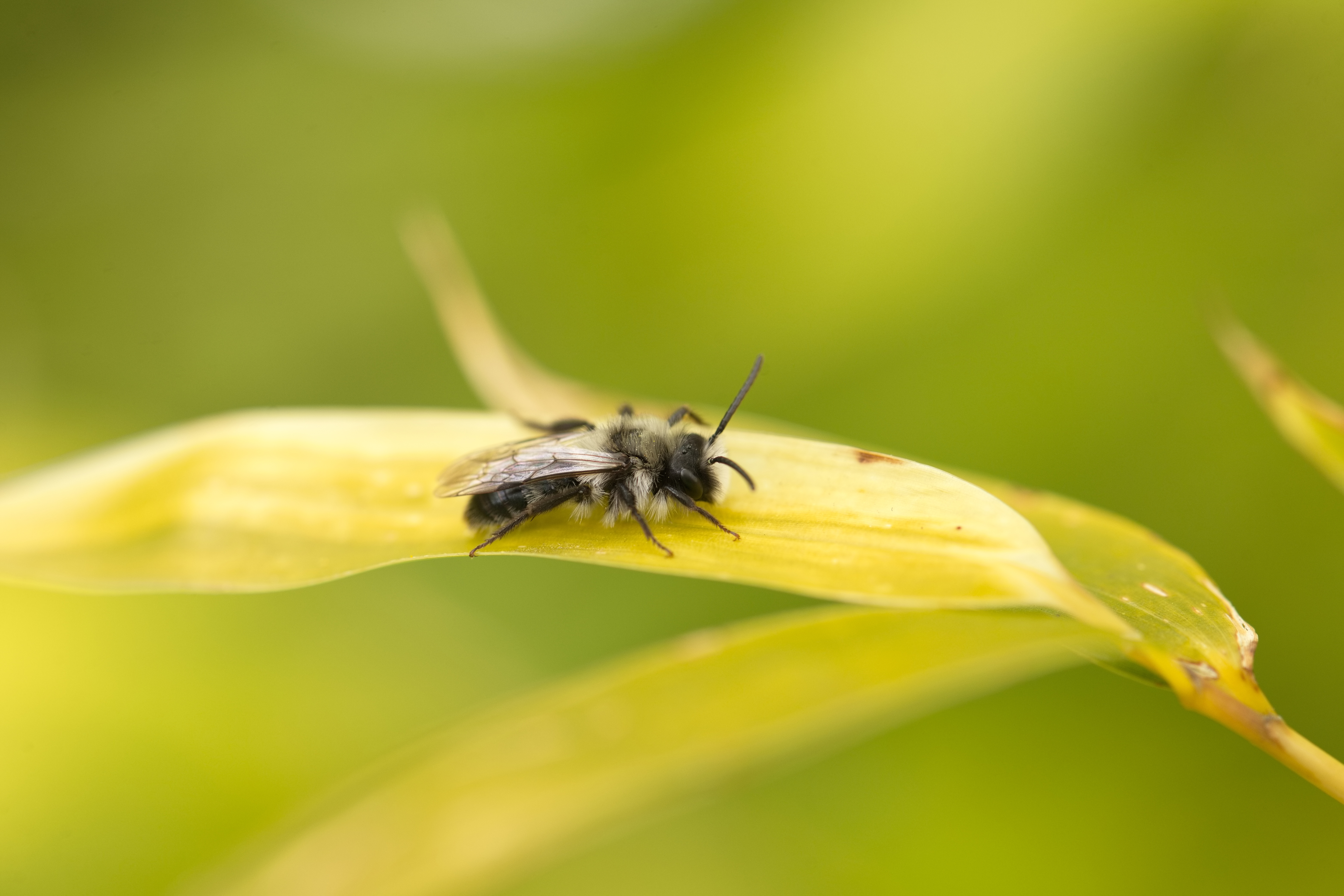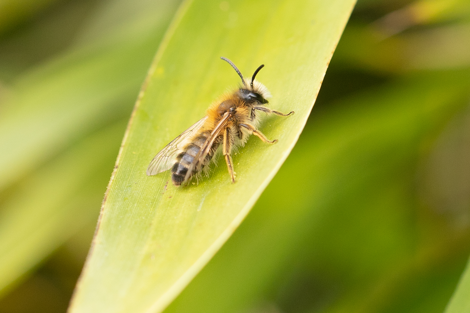 Rotpelzige Sandbiene (Andrena fulva) auf einem Bambusblatt