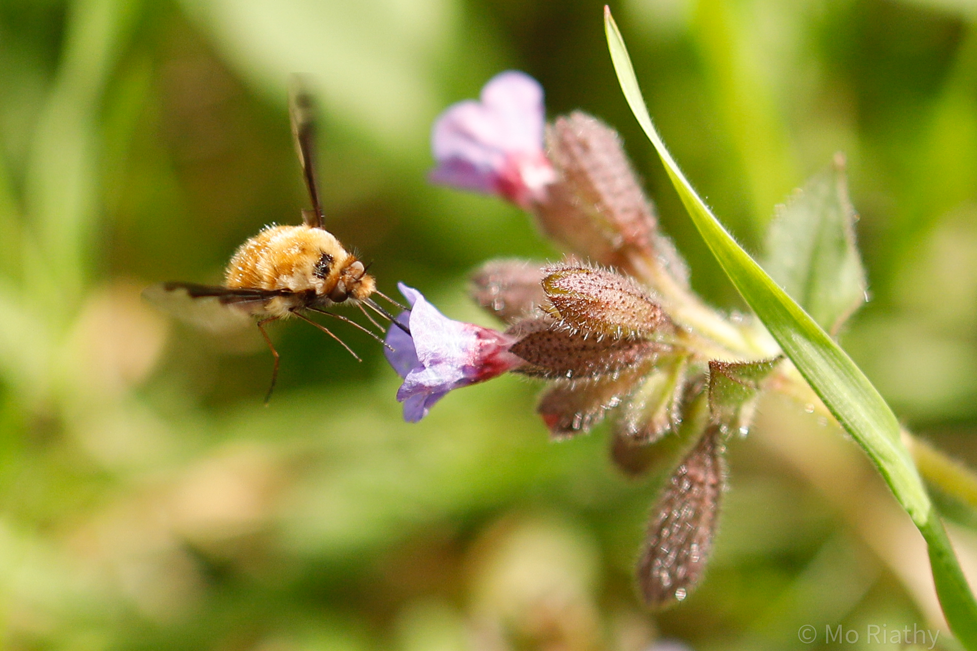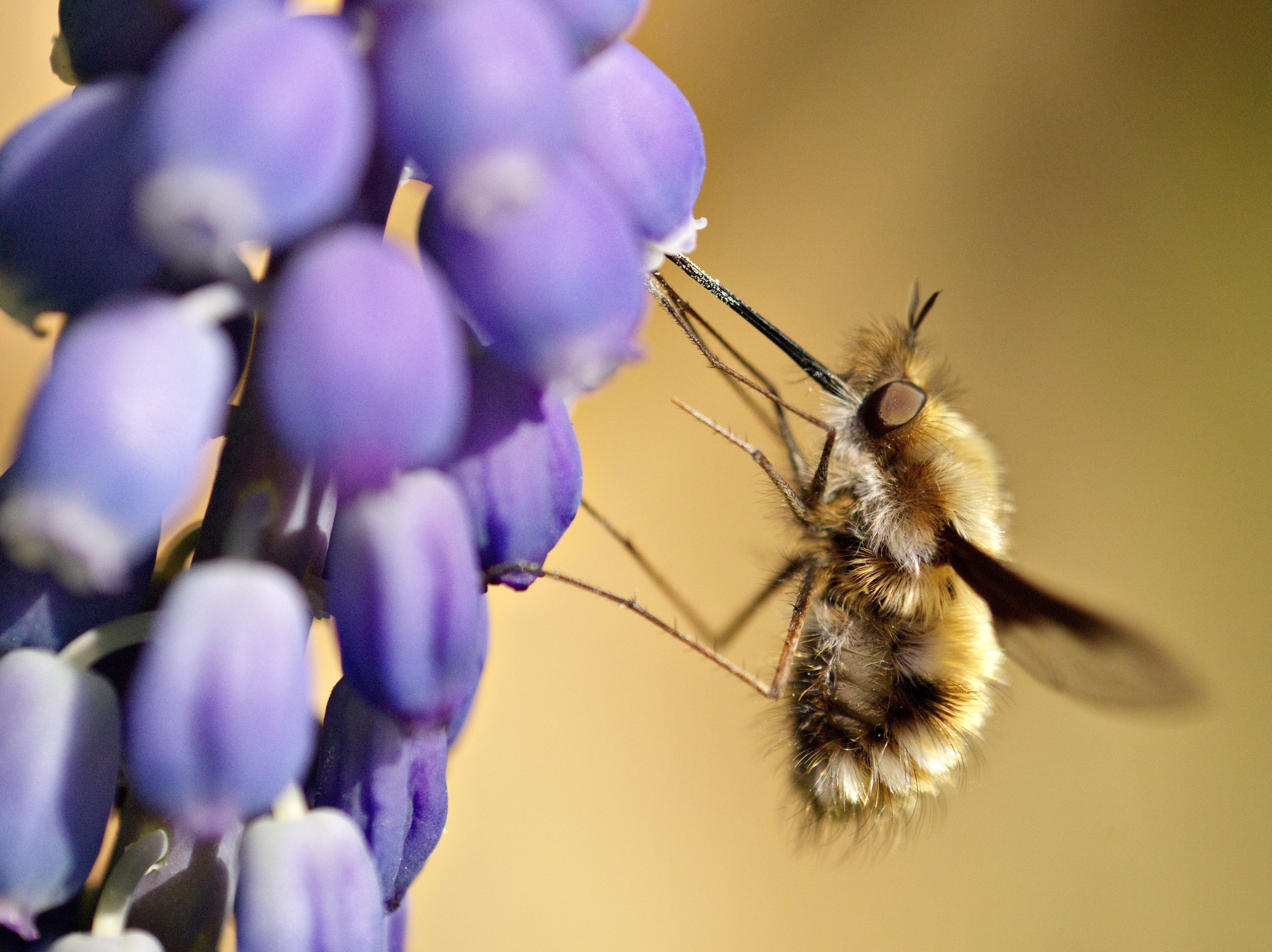 Großer Wollschweber (Bombylius major) an einer Traubenhyazinthe