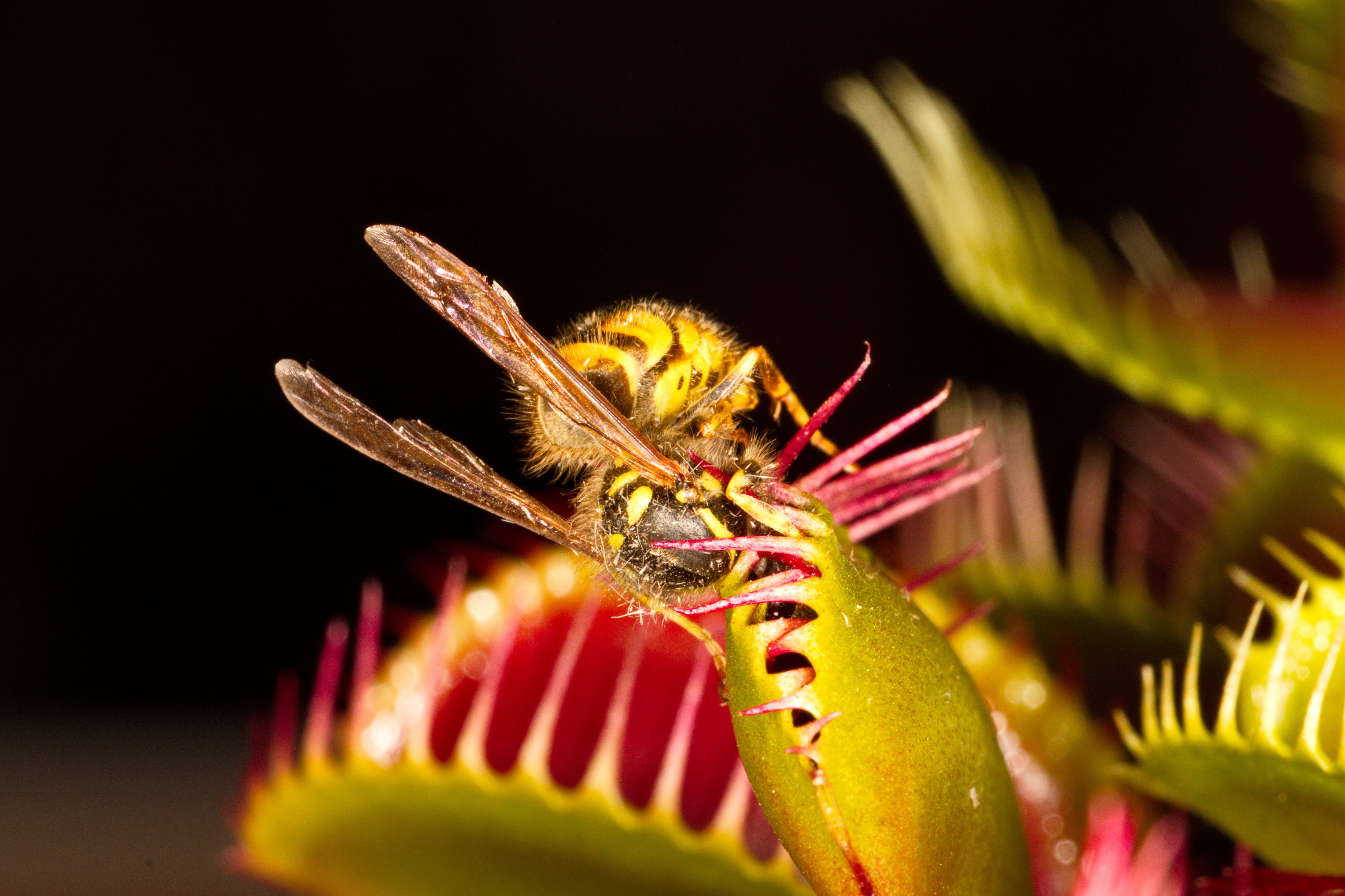 Venusfliegenfalle mit einer gefangenen Wespe.