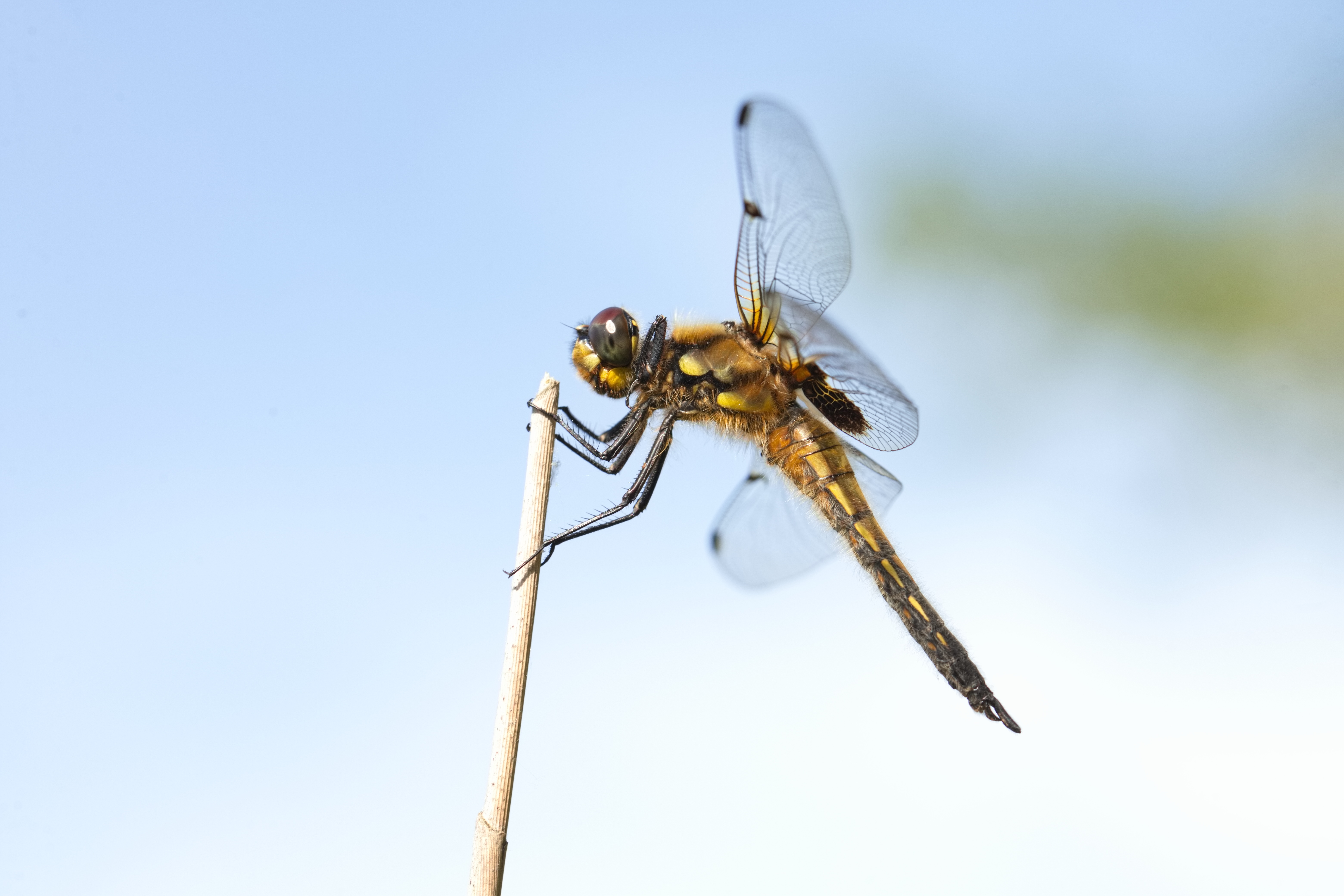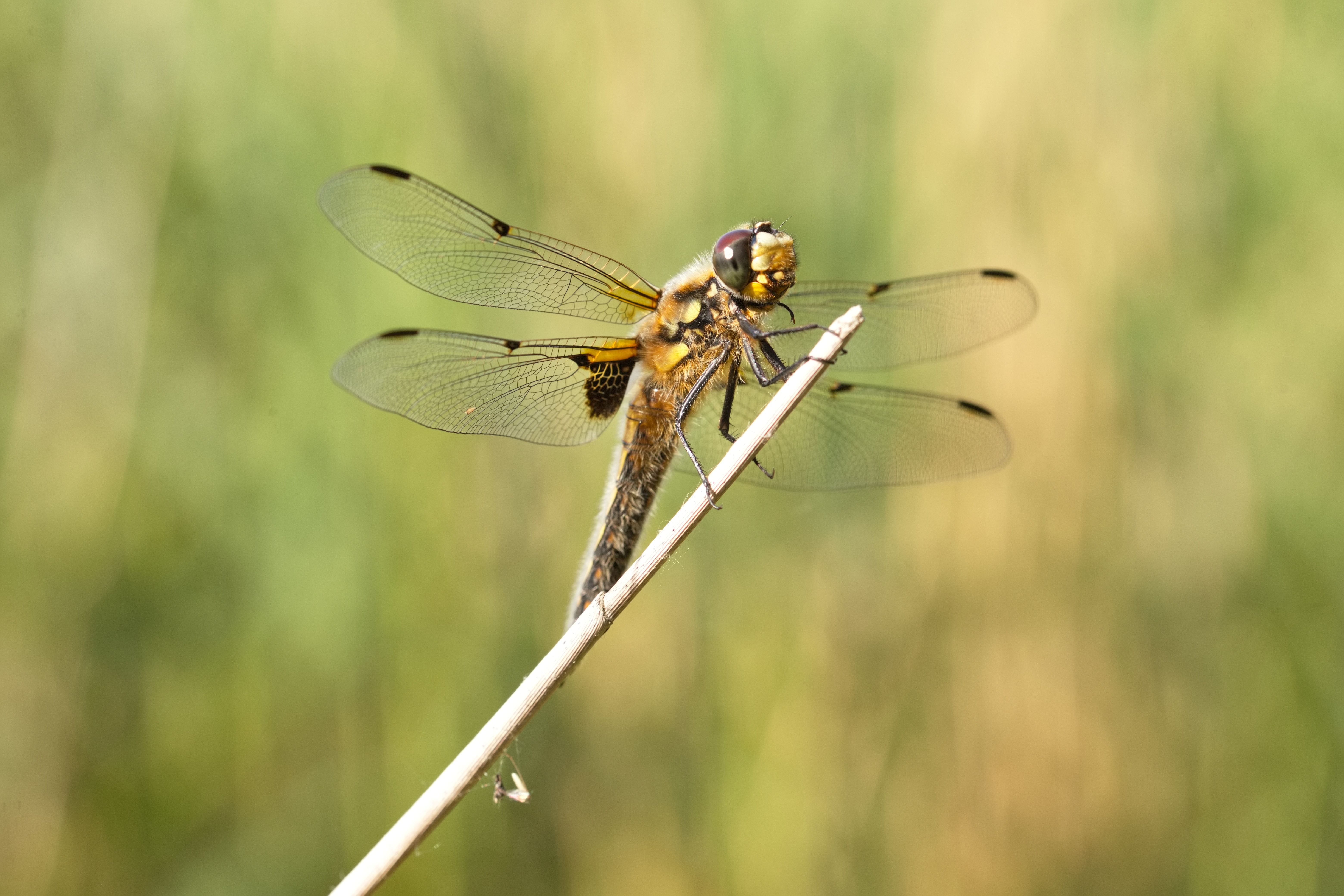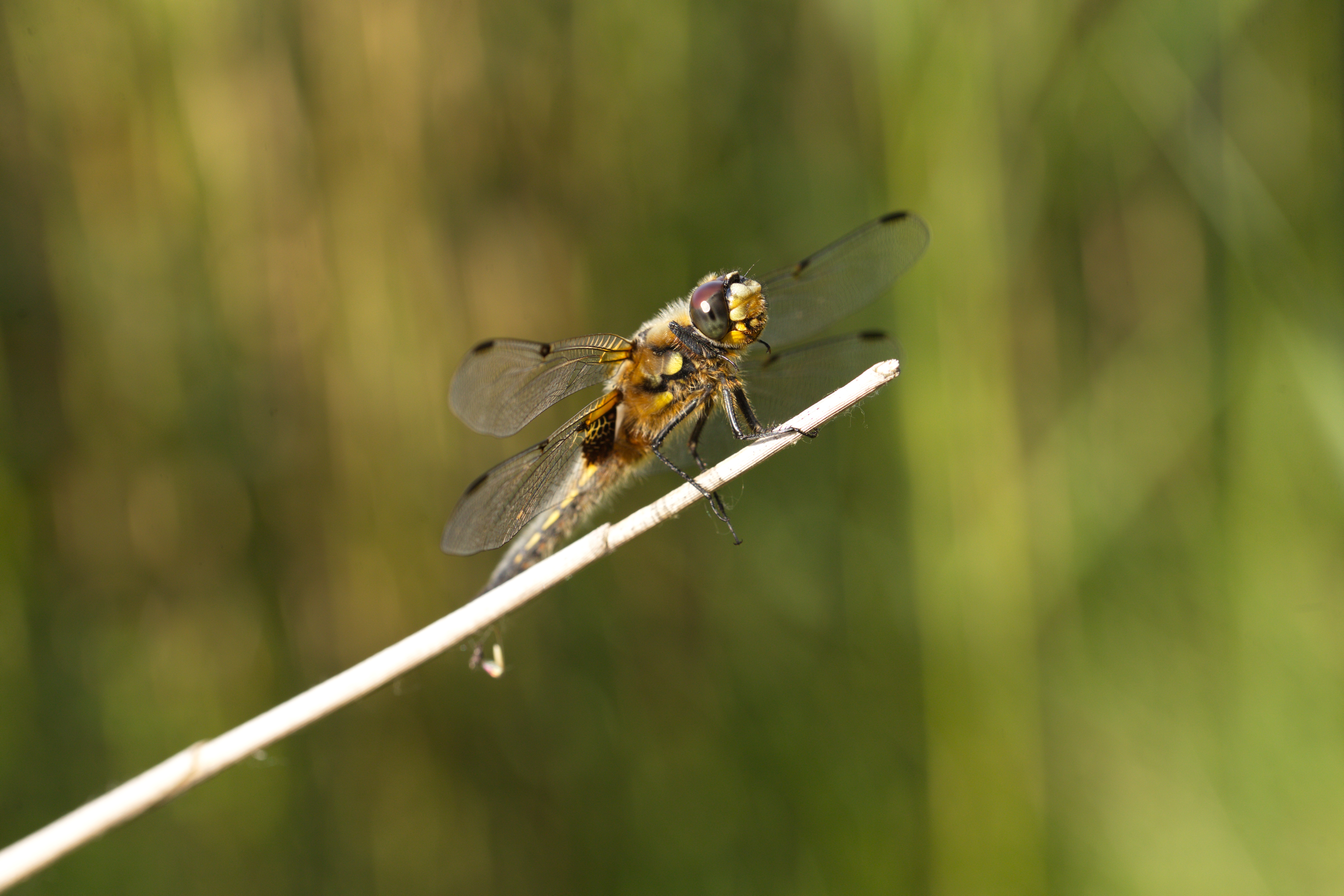 Vierfleck (Libellula quadrimaculata) auf einem Schilfhalm