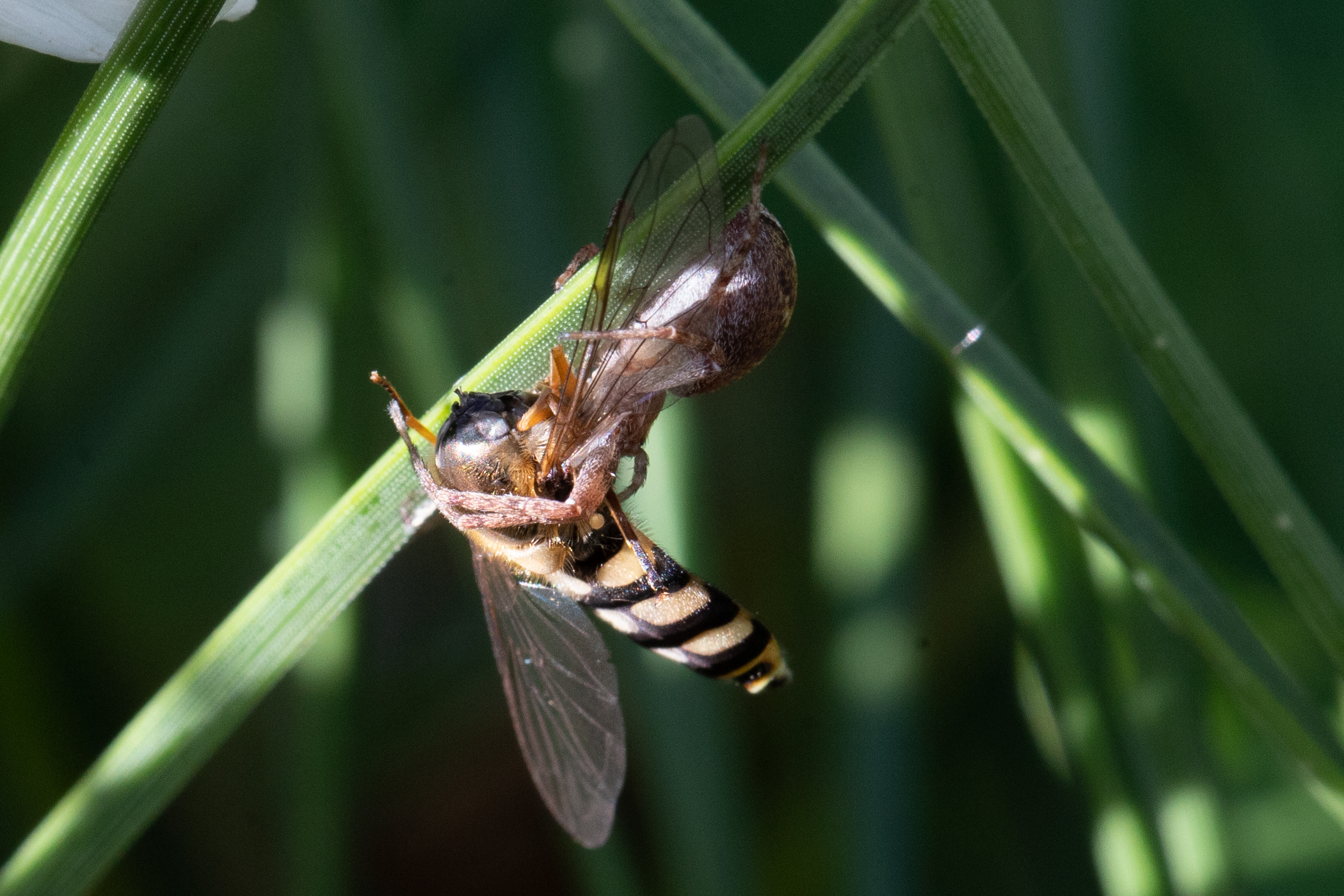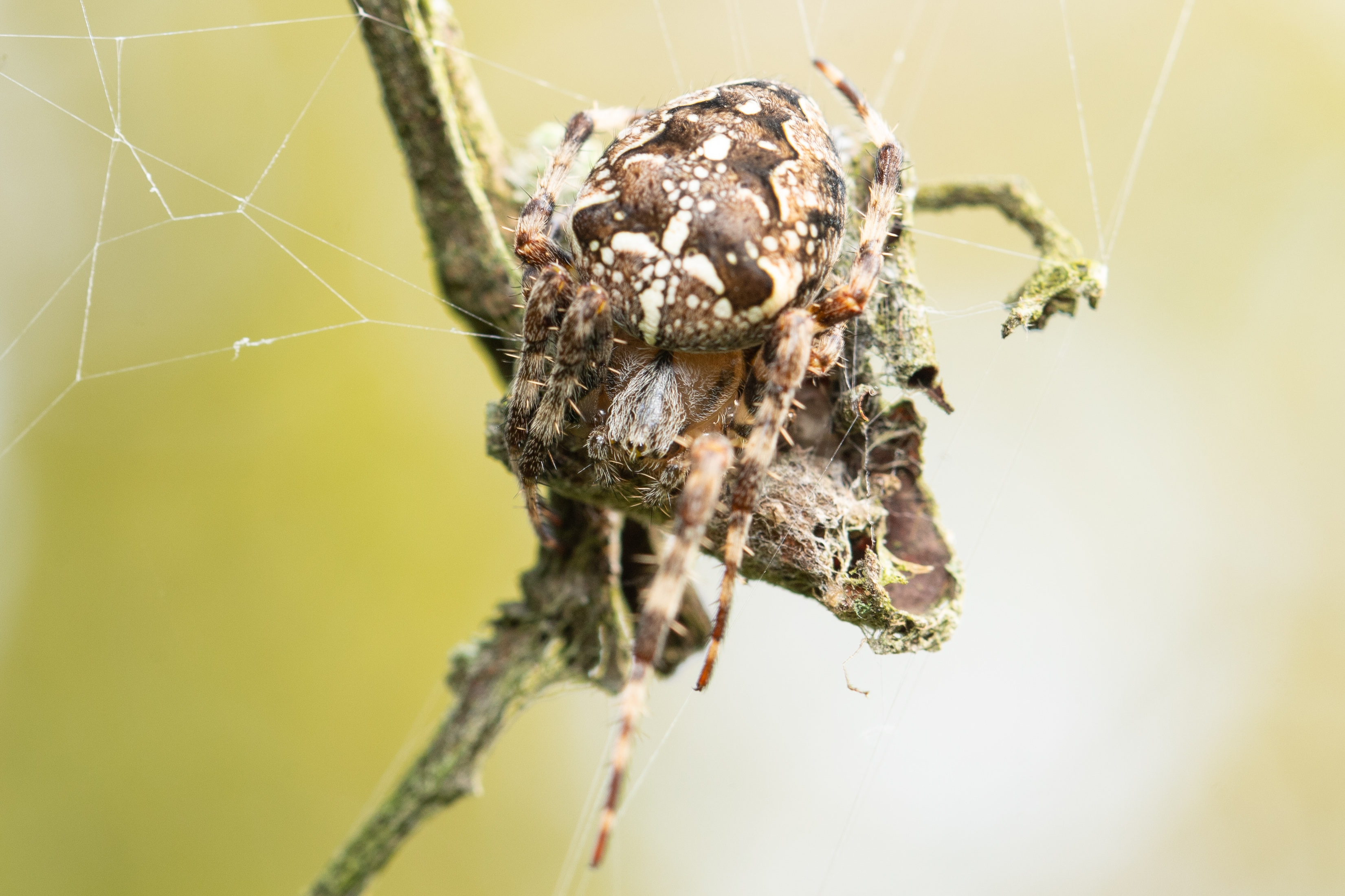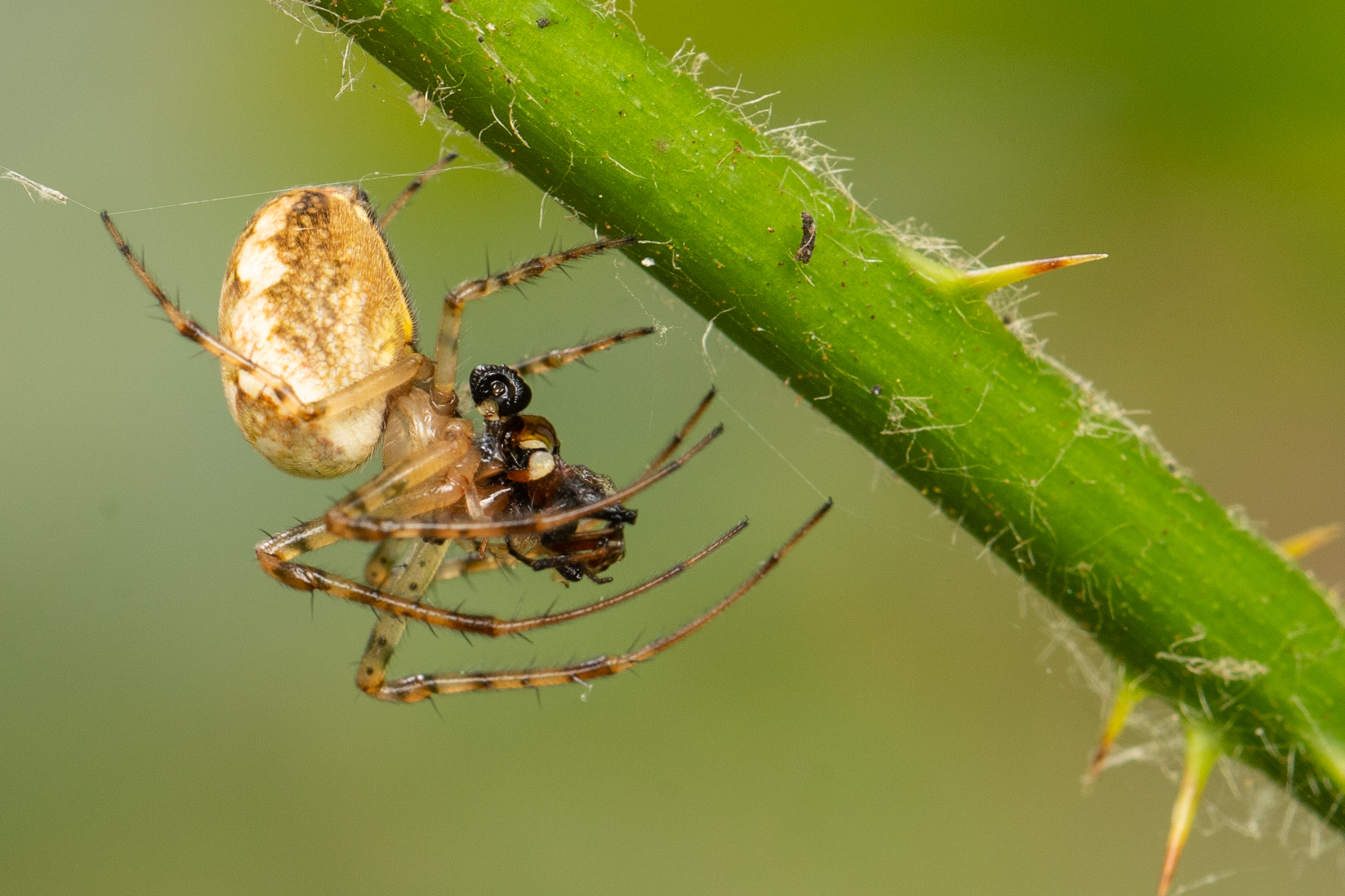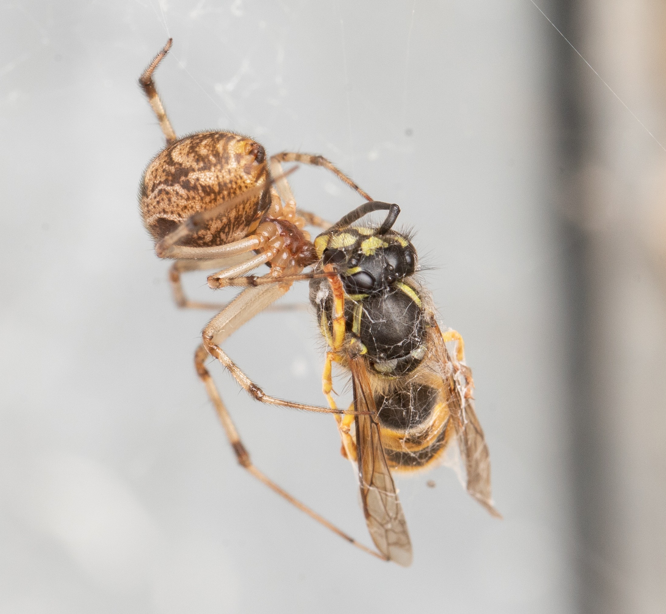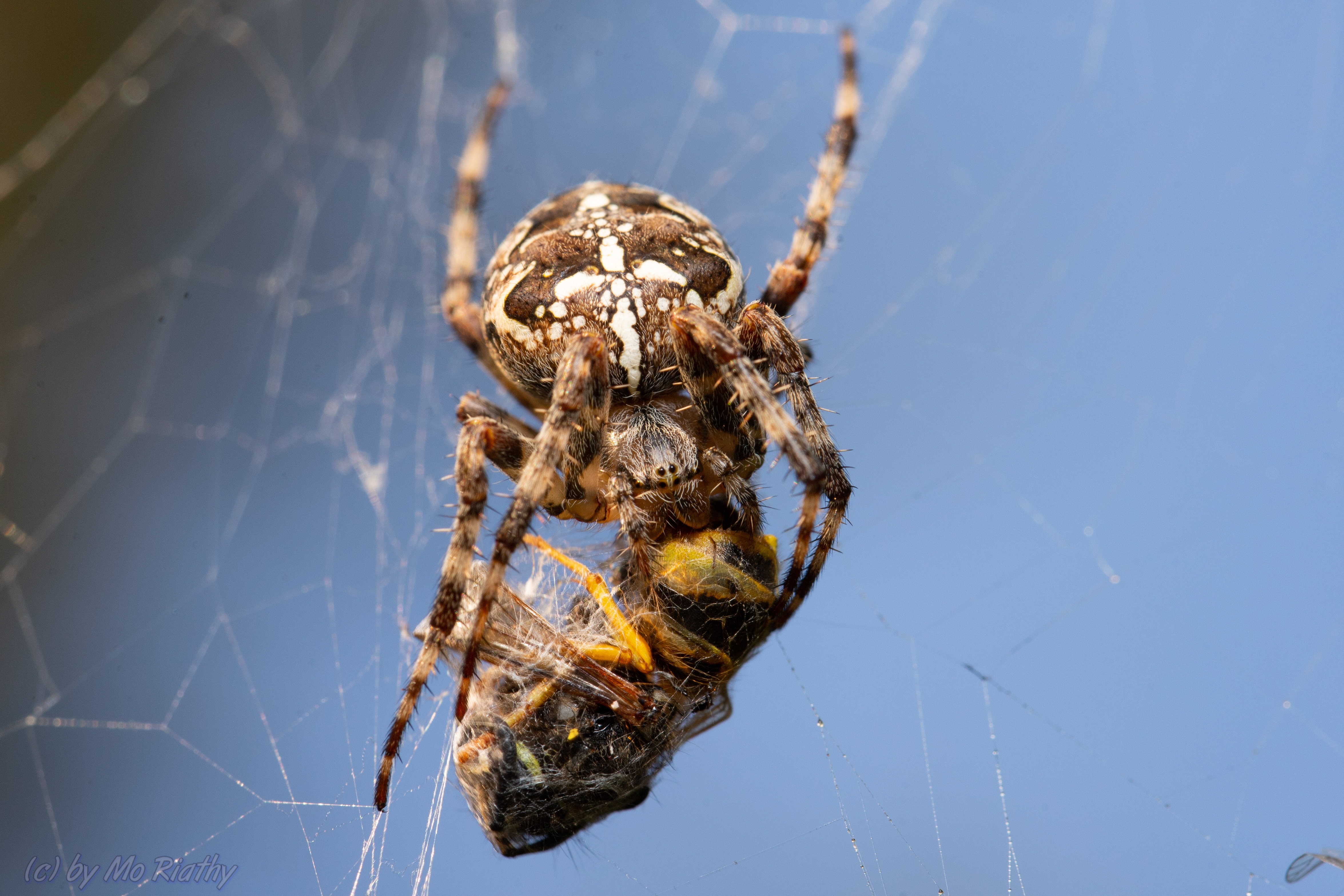 Gartenkreuzspinne (Araneus diadematus) mit einer Wespe als Beute.