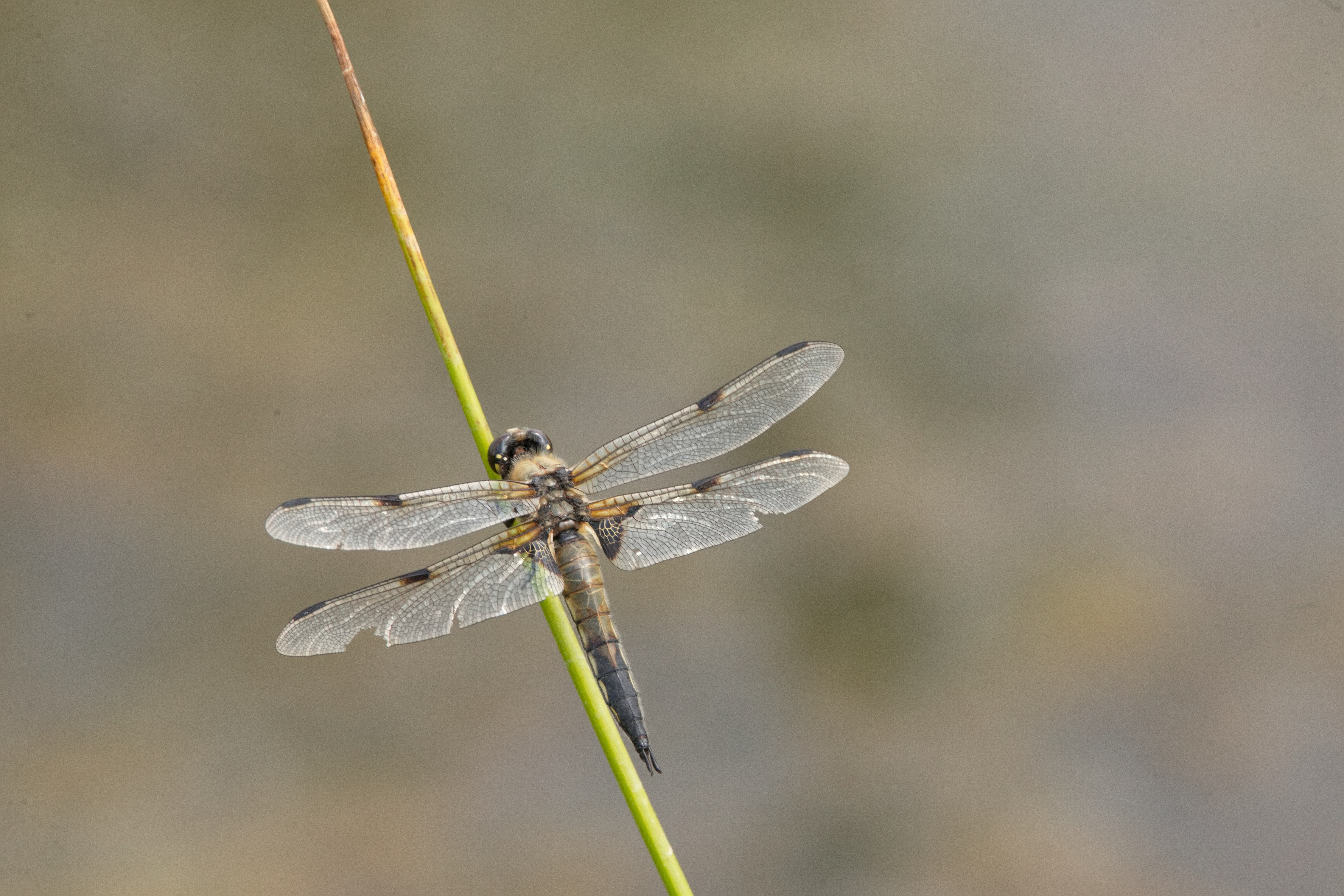 Ein Vierfleck (Libellula Quadrimiculata) auf einem Halm.