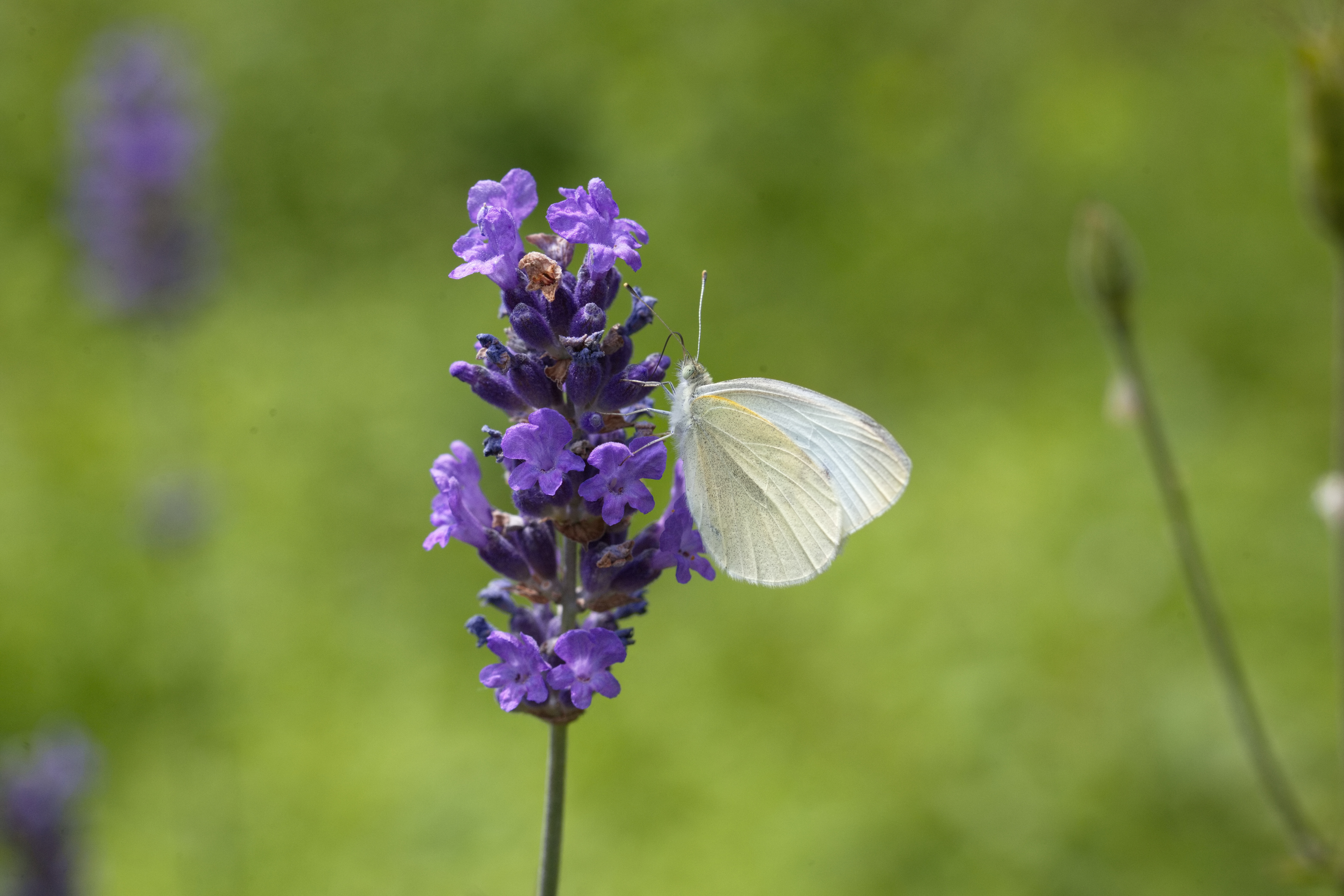 Kleiner Kohlweißling (Pieris rapae) auf einer Lavendelblüte.