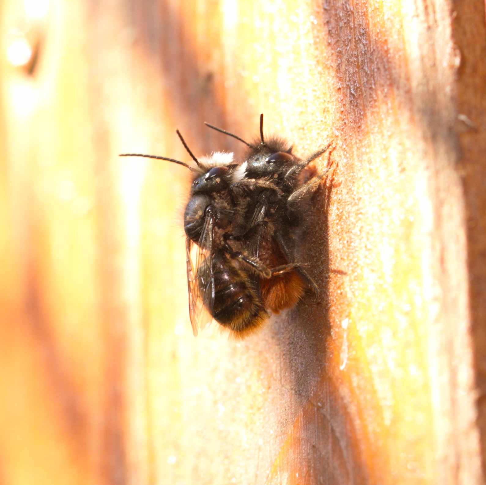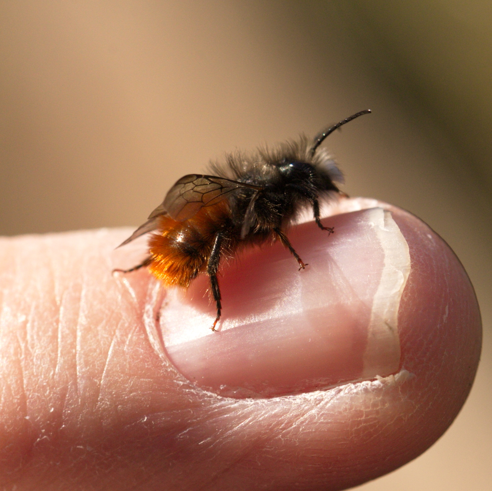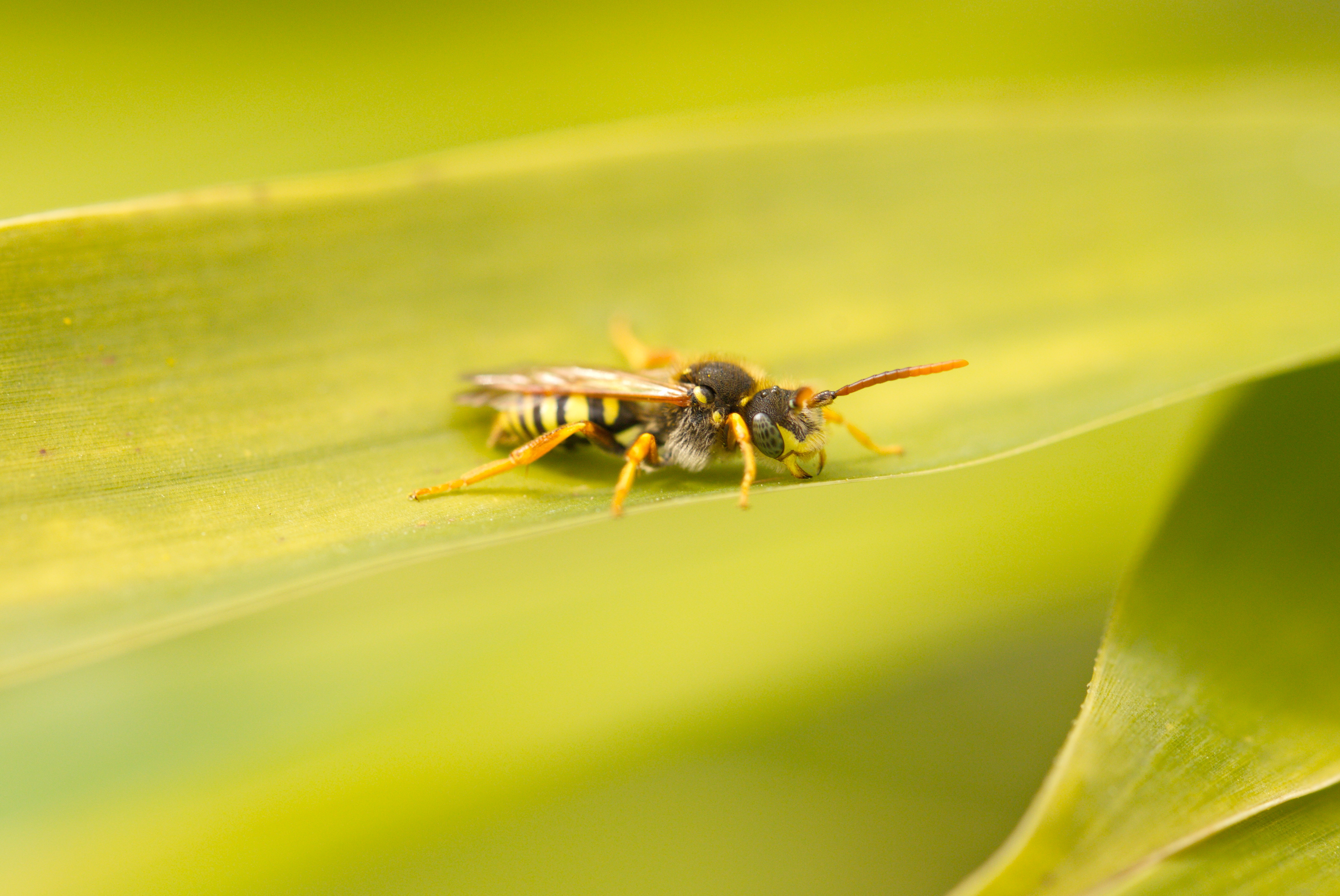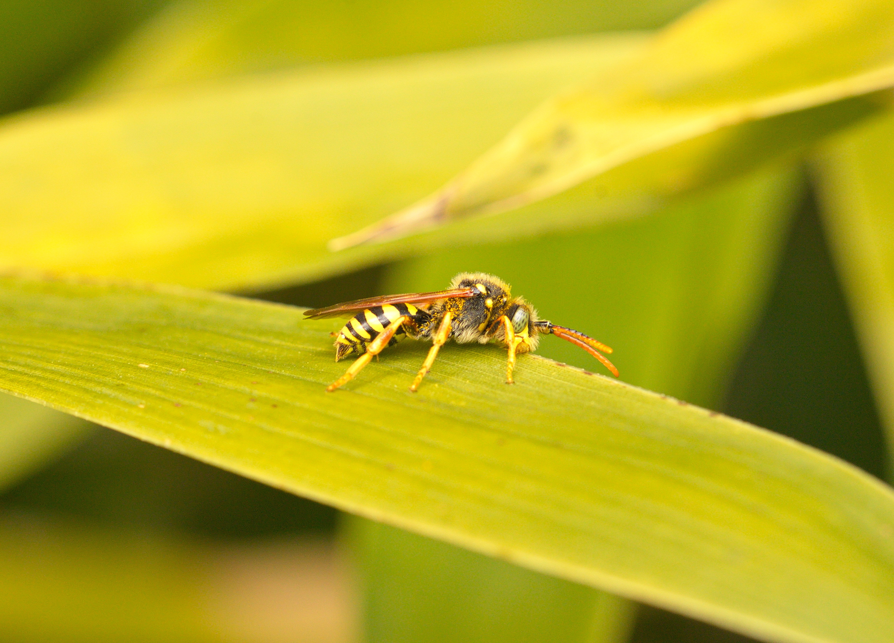 Gegürtete Wespenbiene (Nomada succincta) auf meinem Finger.