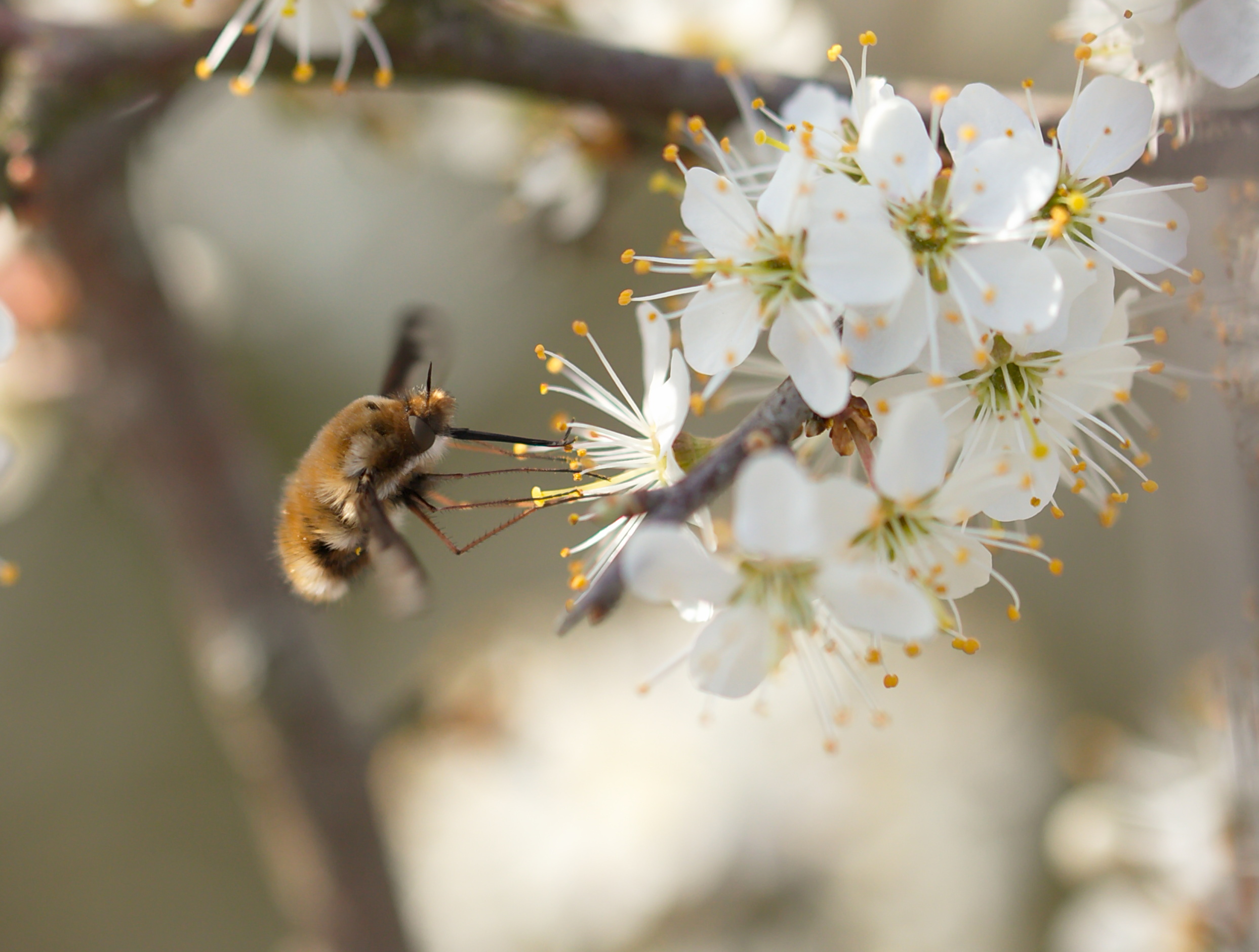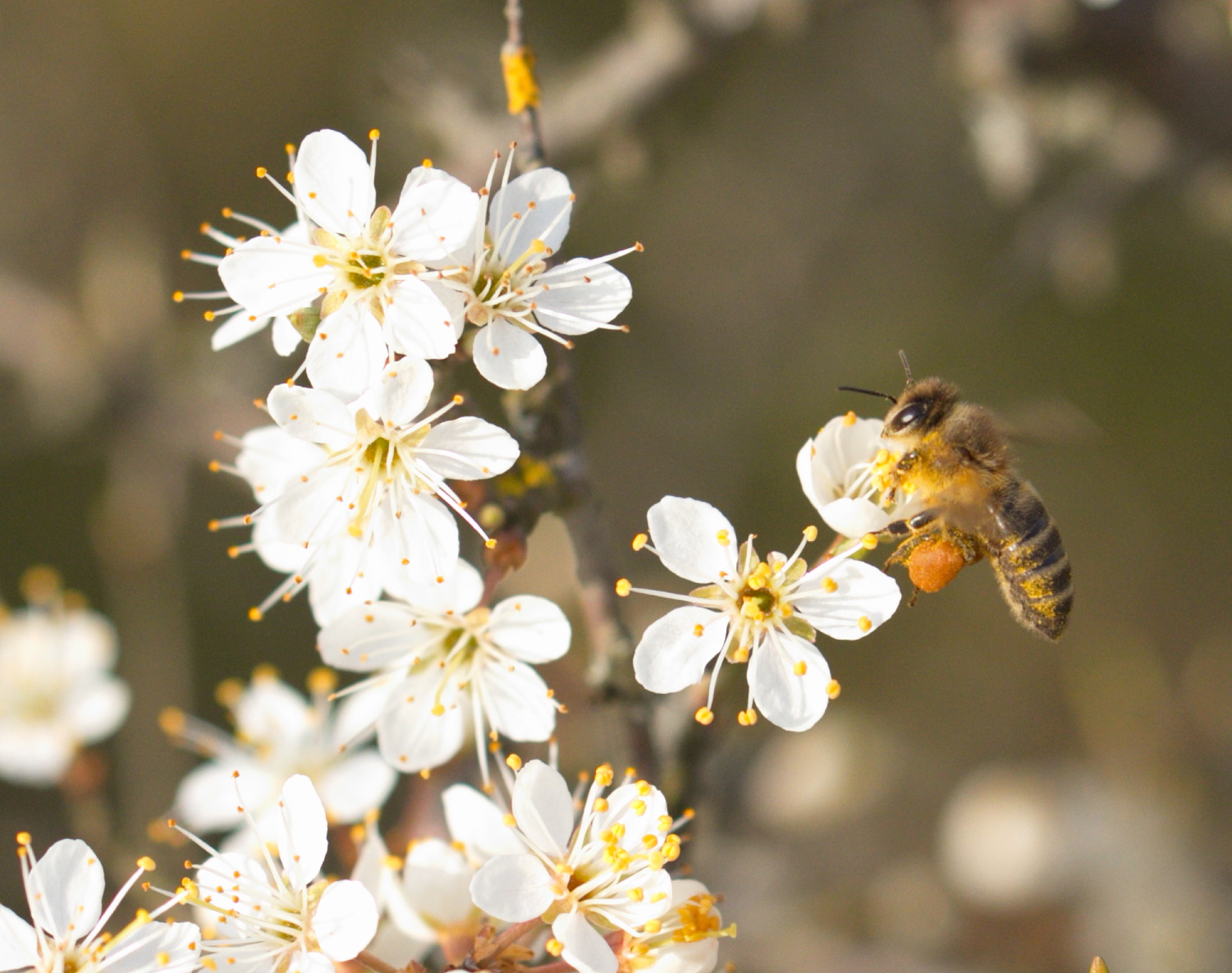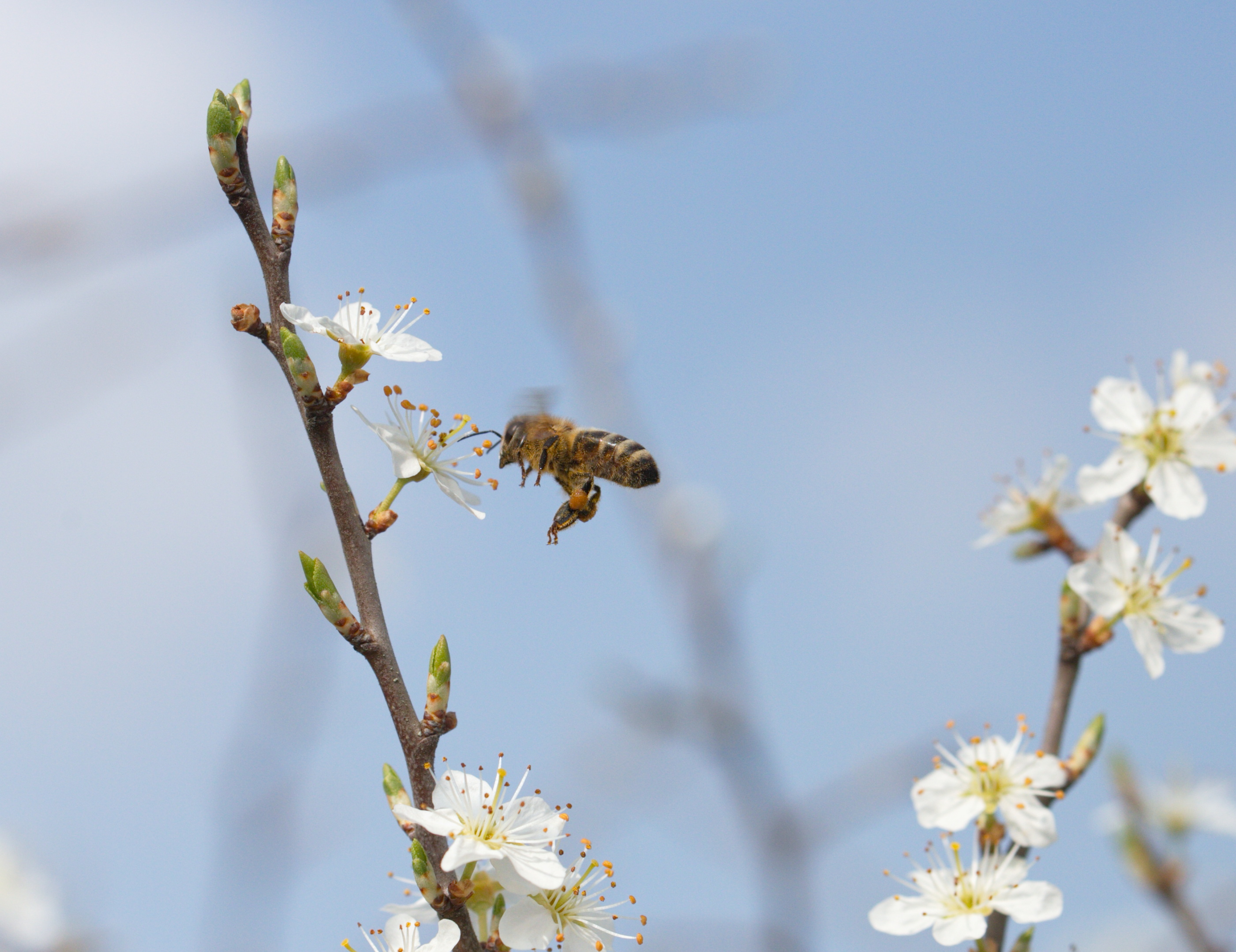Westliche Hoigbiene (Apis mellifera) im Anflug auf Schlehdorn-Blüte.