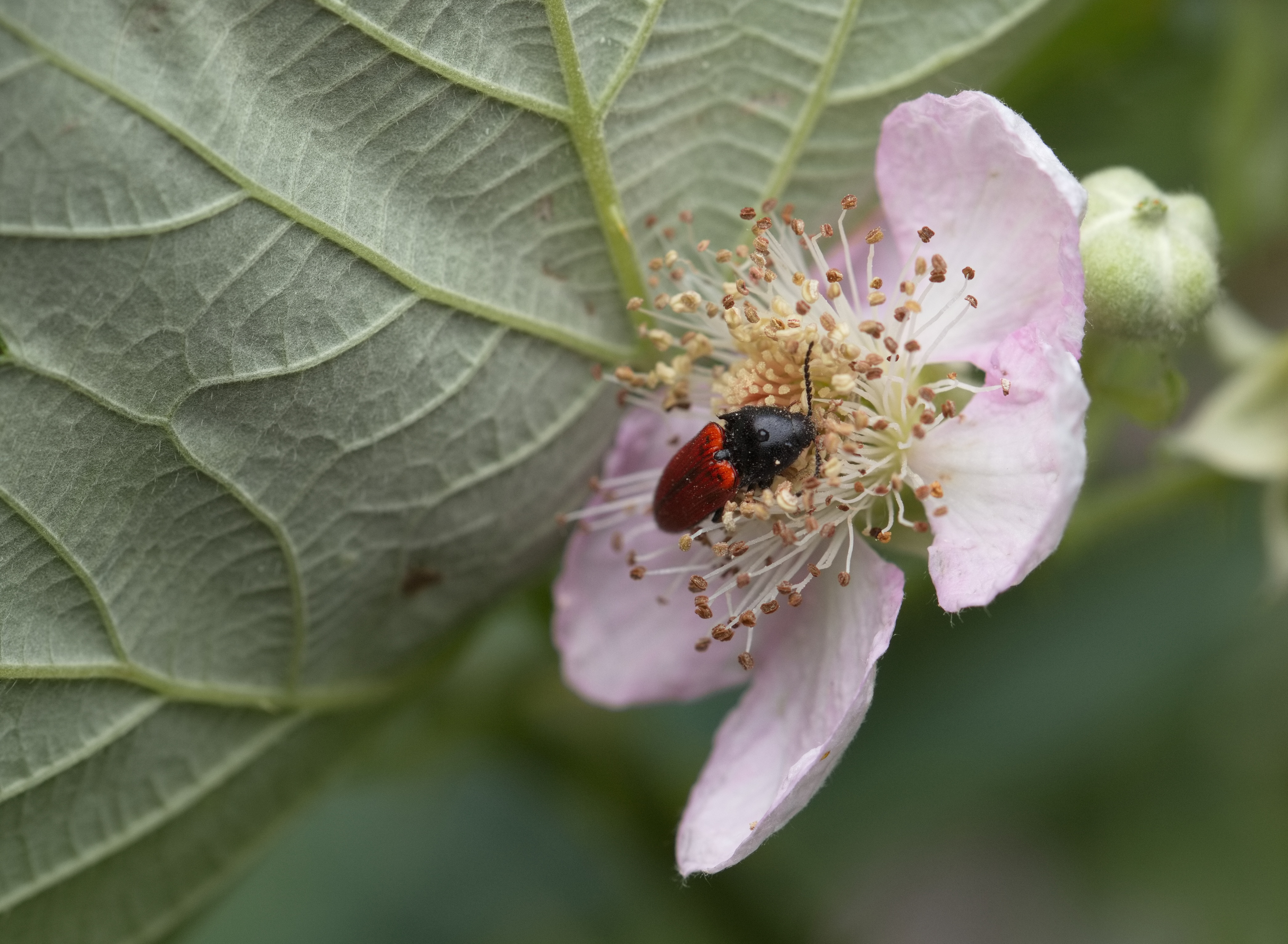 Beherzter Halsbock (Stictoleptura cordigera) auf eines Brommbeerstrauches.