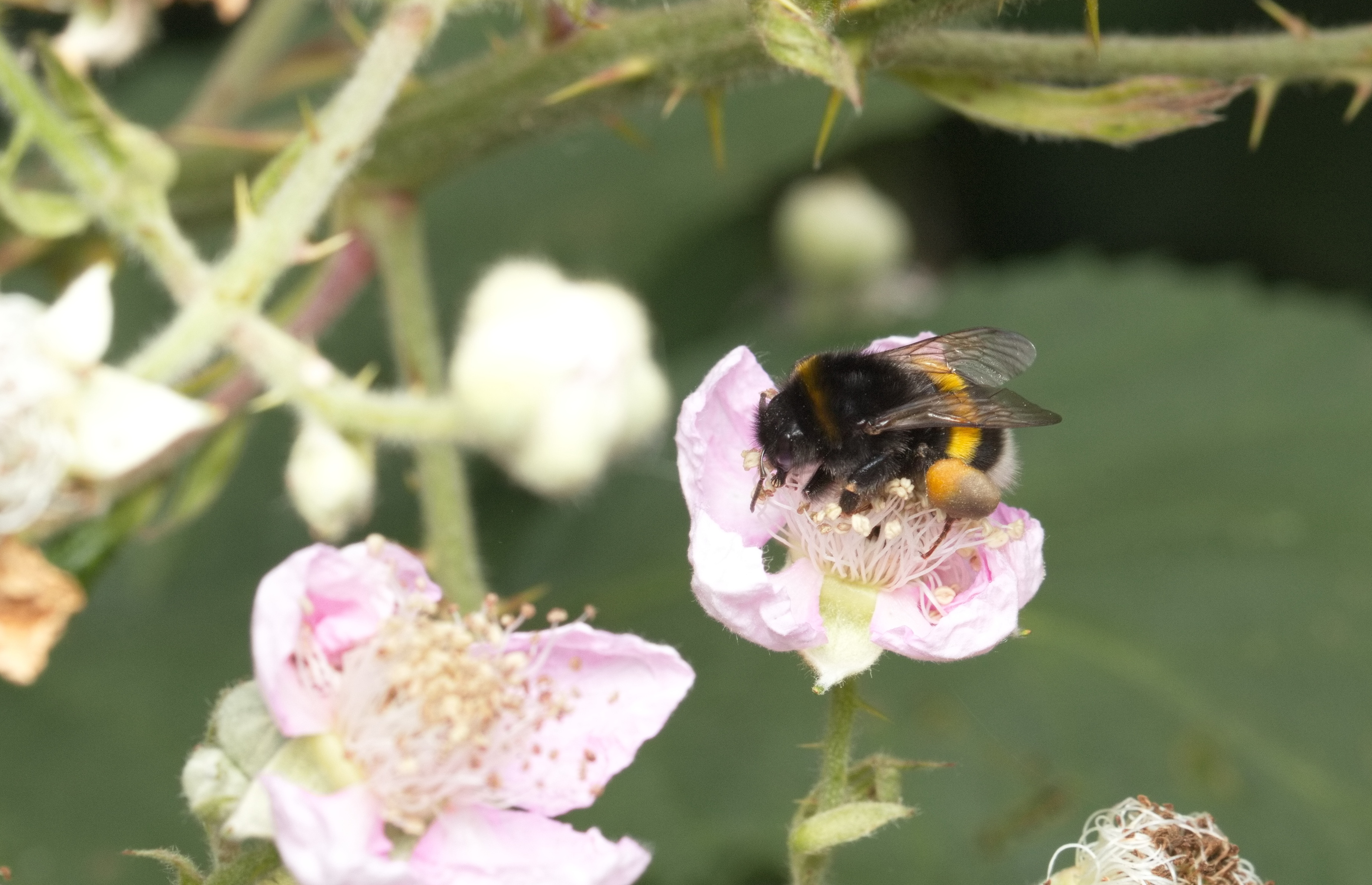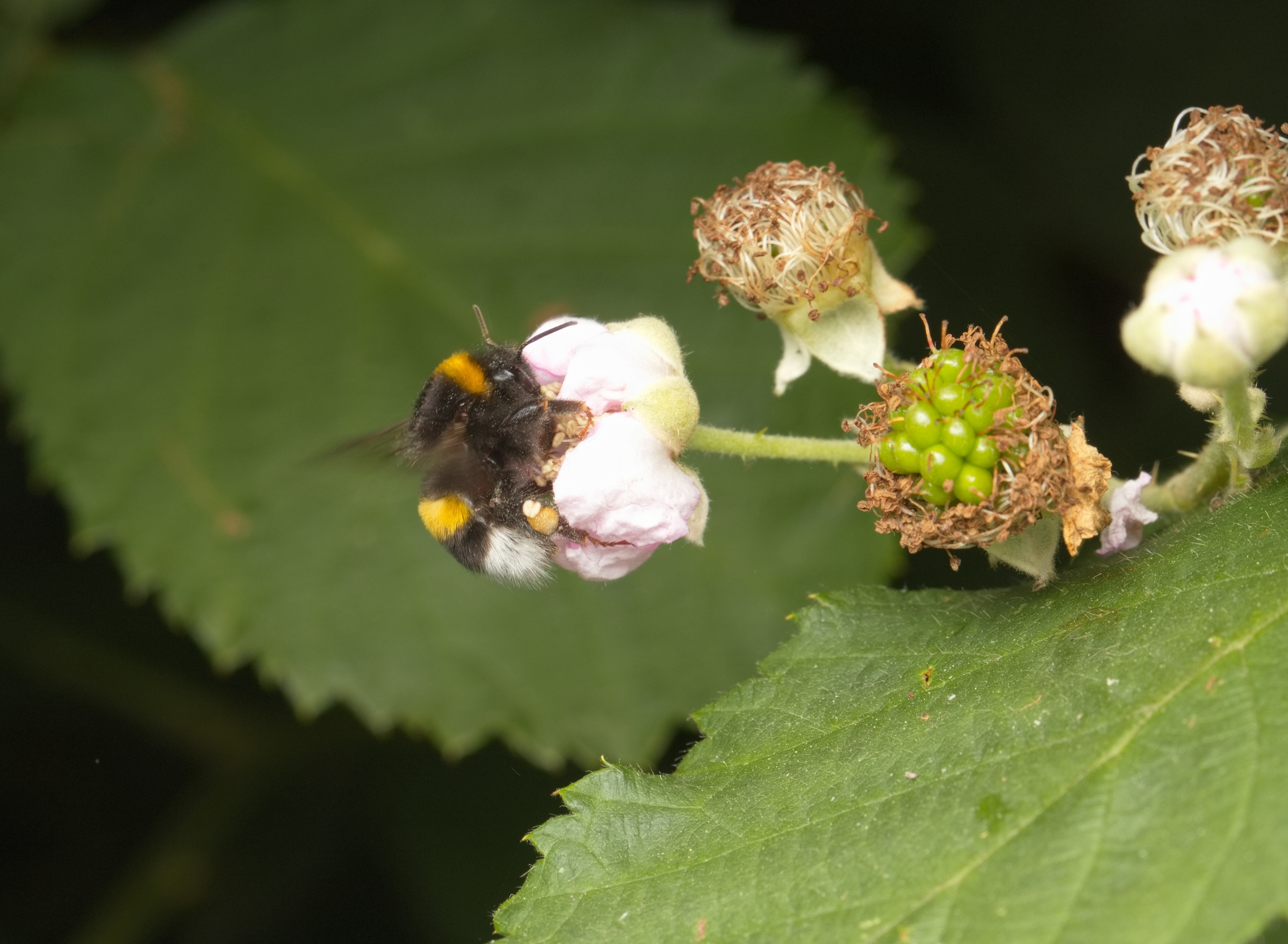 Weißschwänzige Erdhummel (Bombus lucorum) auf einer Brombeerblüte.