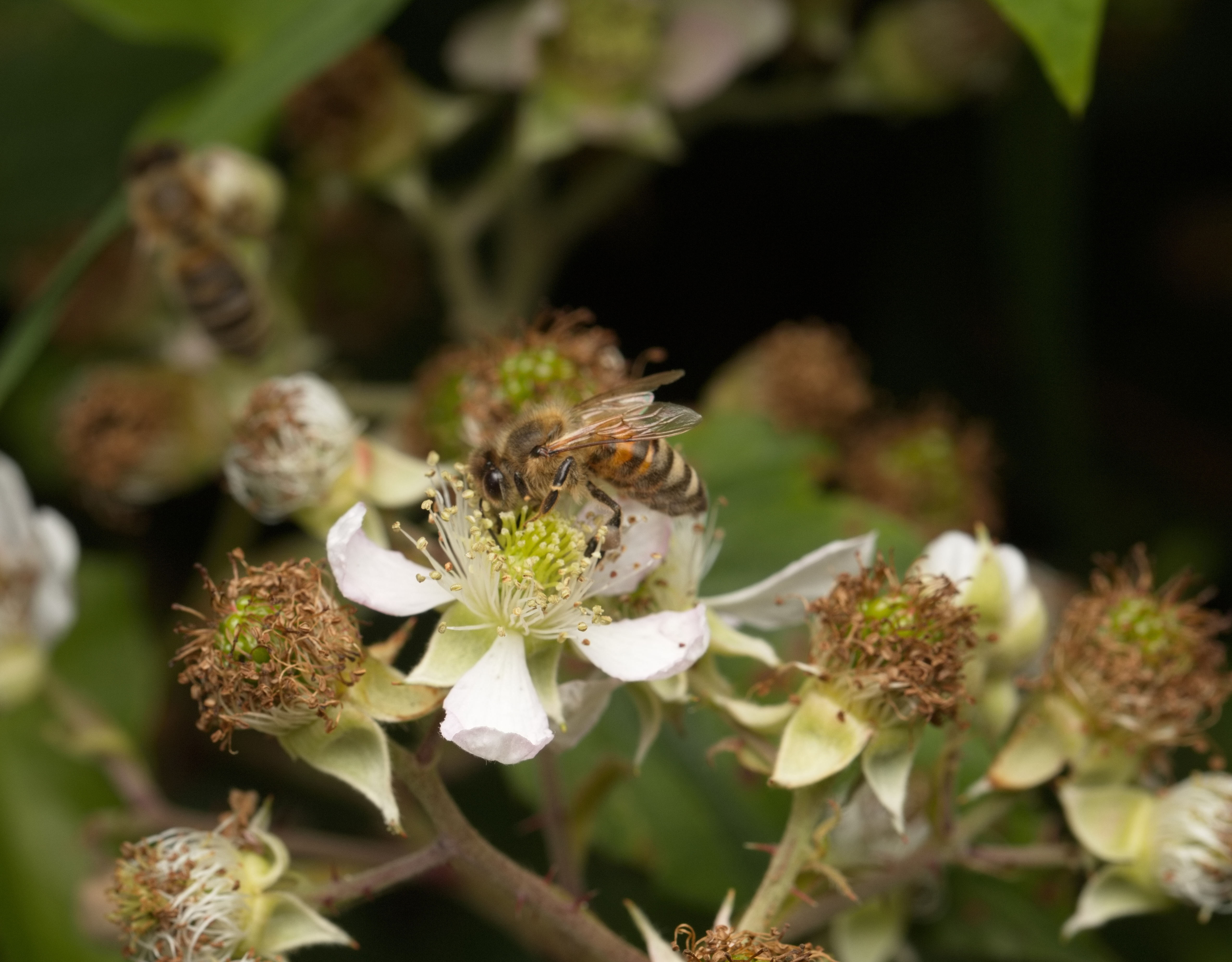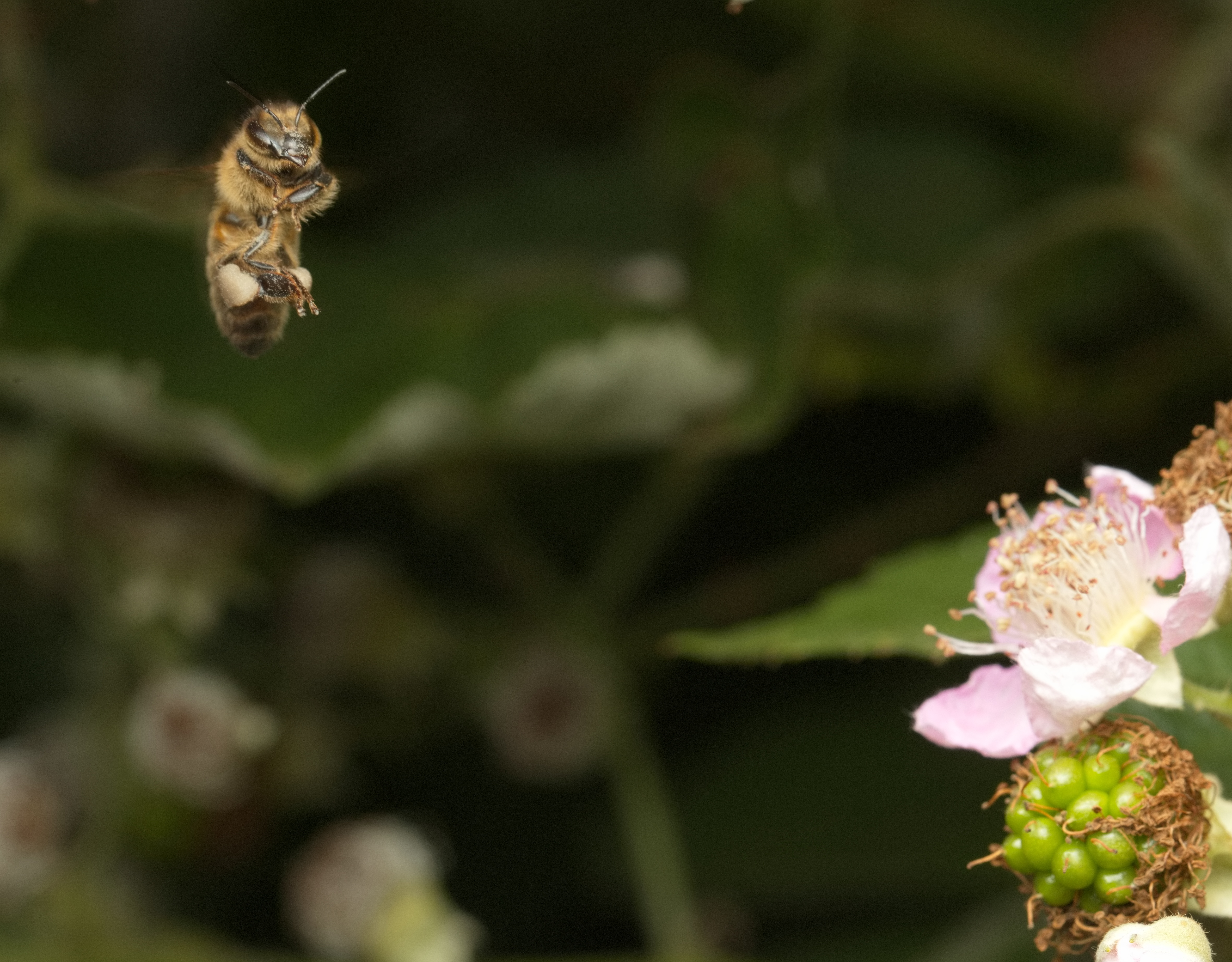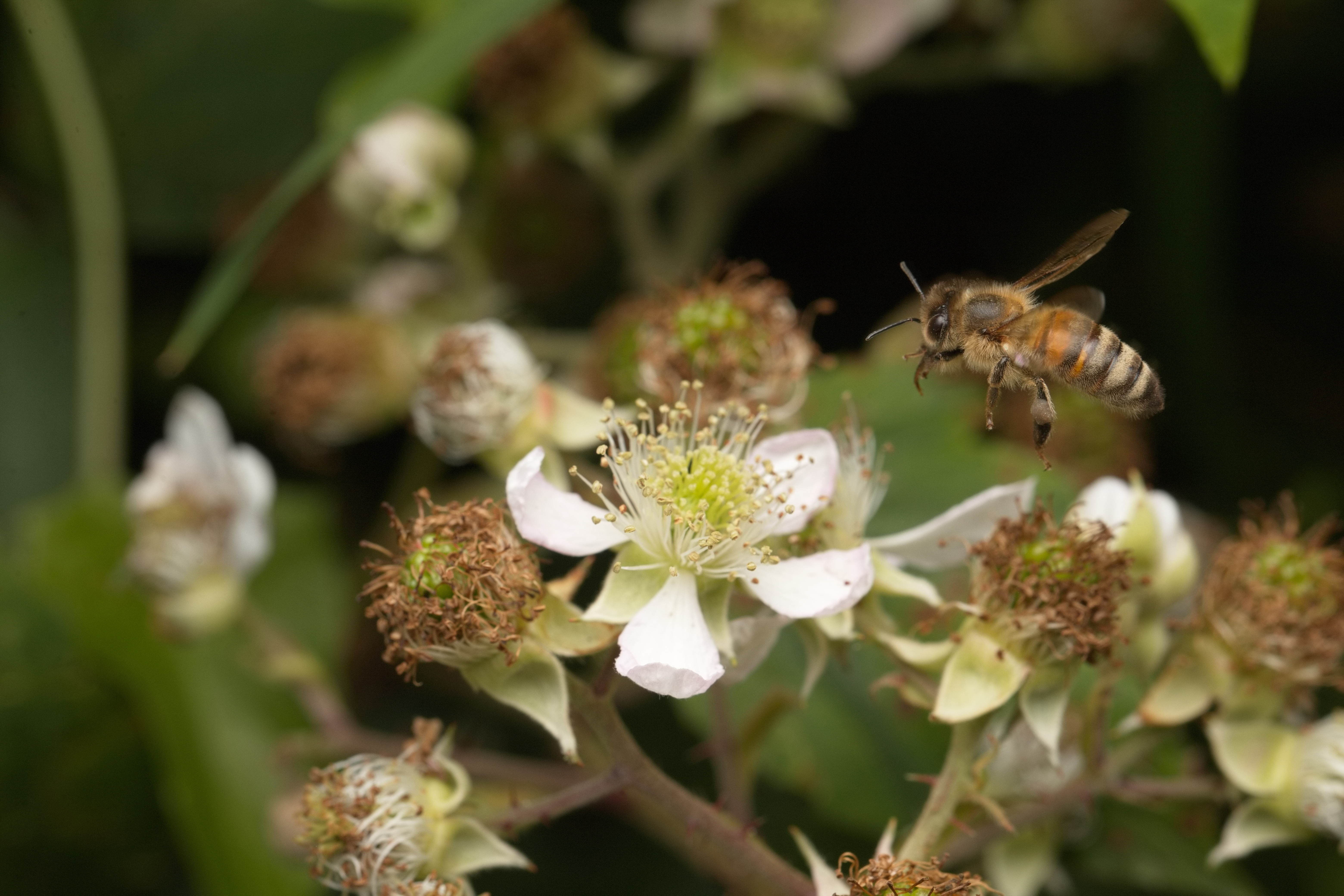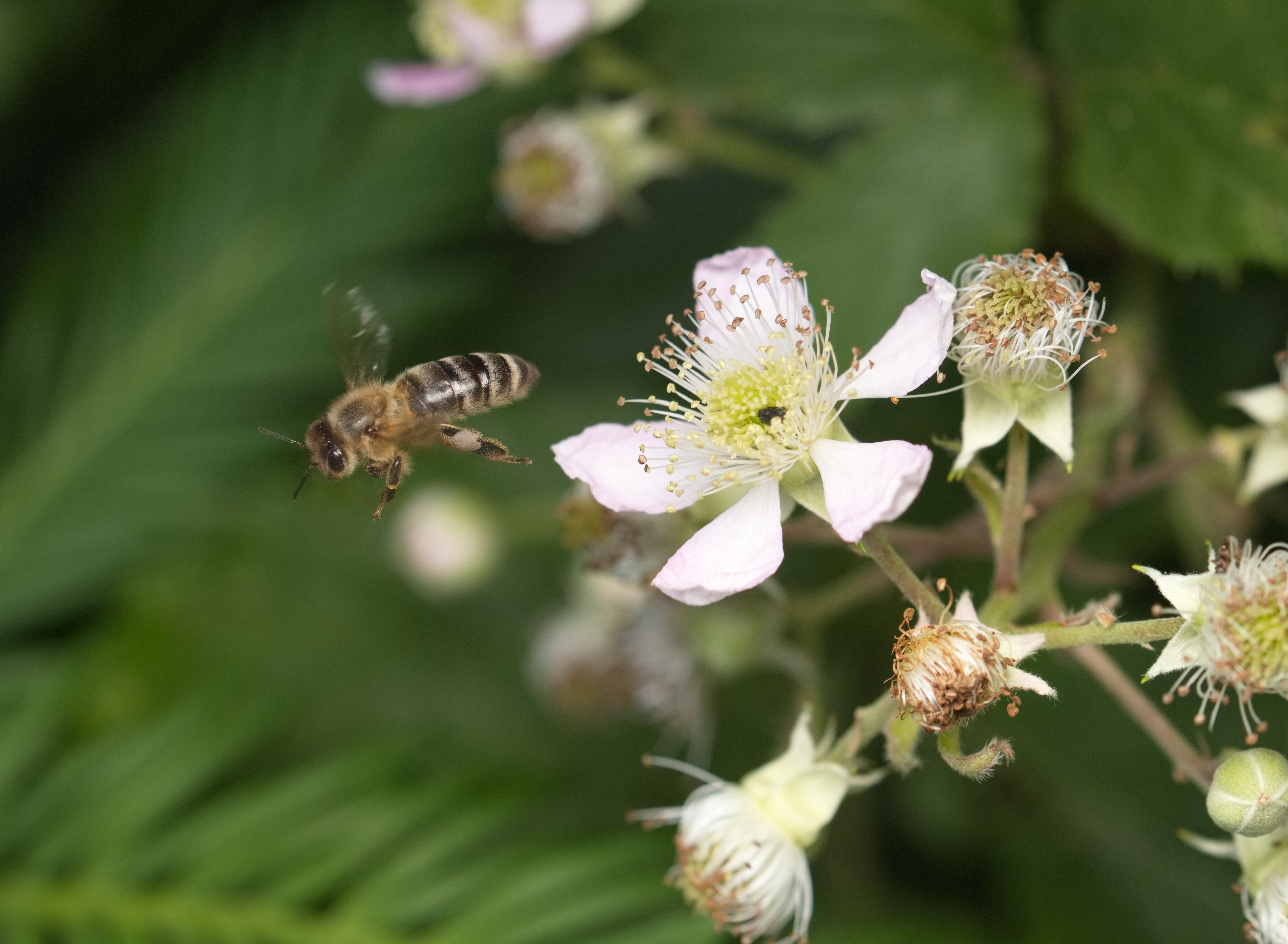 Westliche Honigbiene (Apis mellifera) im Anflug auf eine Brombeerblüte.