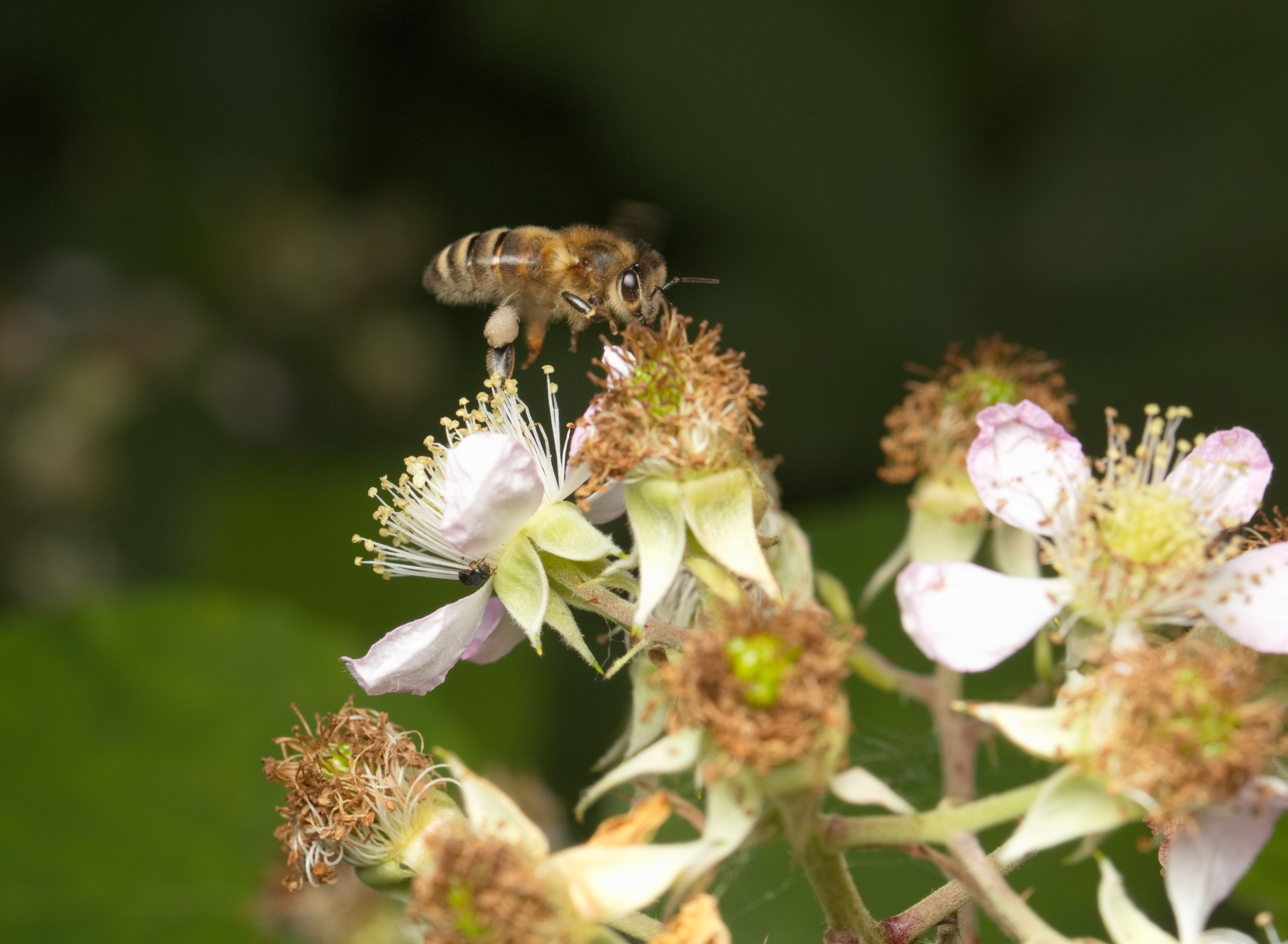 Westliche Honigbiene (Apis mellifera) mit gefüllten Pollentaschen auf einer Brombeerblüte.
