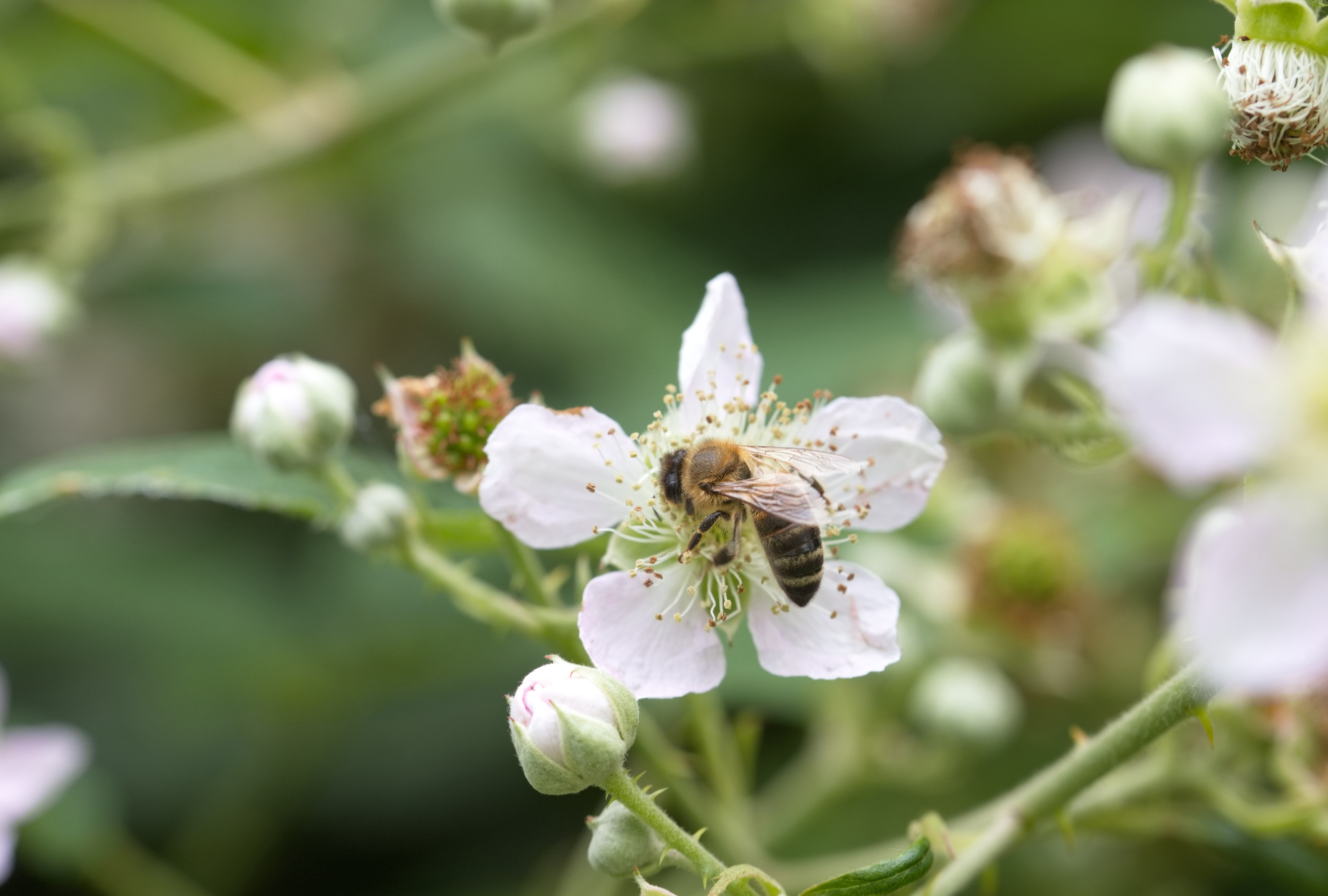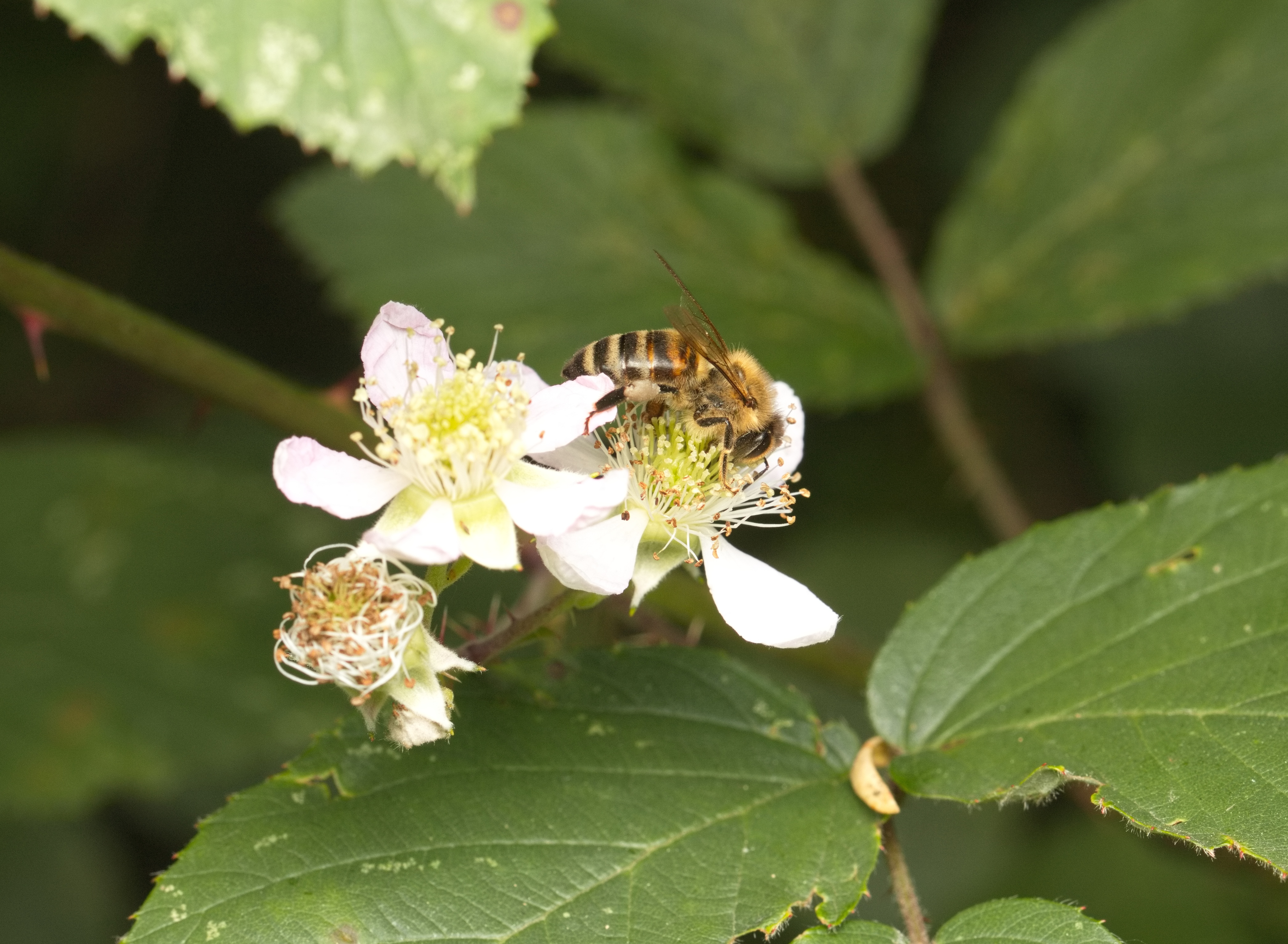Westliche Honigbiene (Apis mellifera) an einer Brombeerblüte.