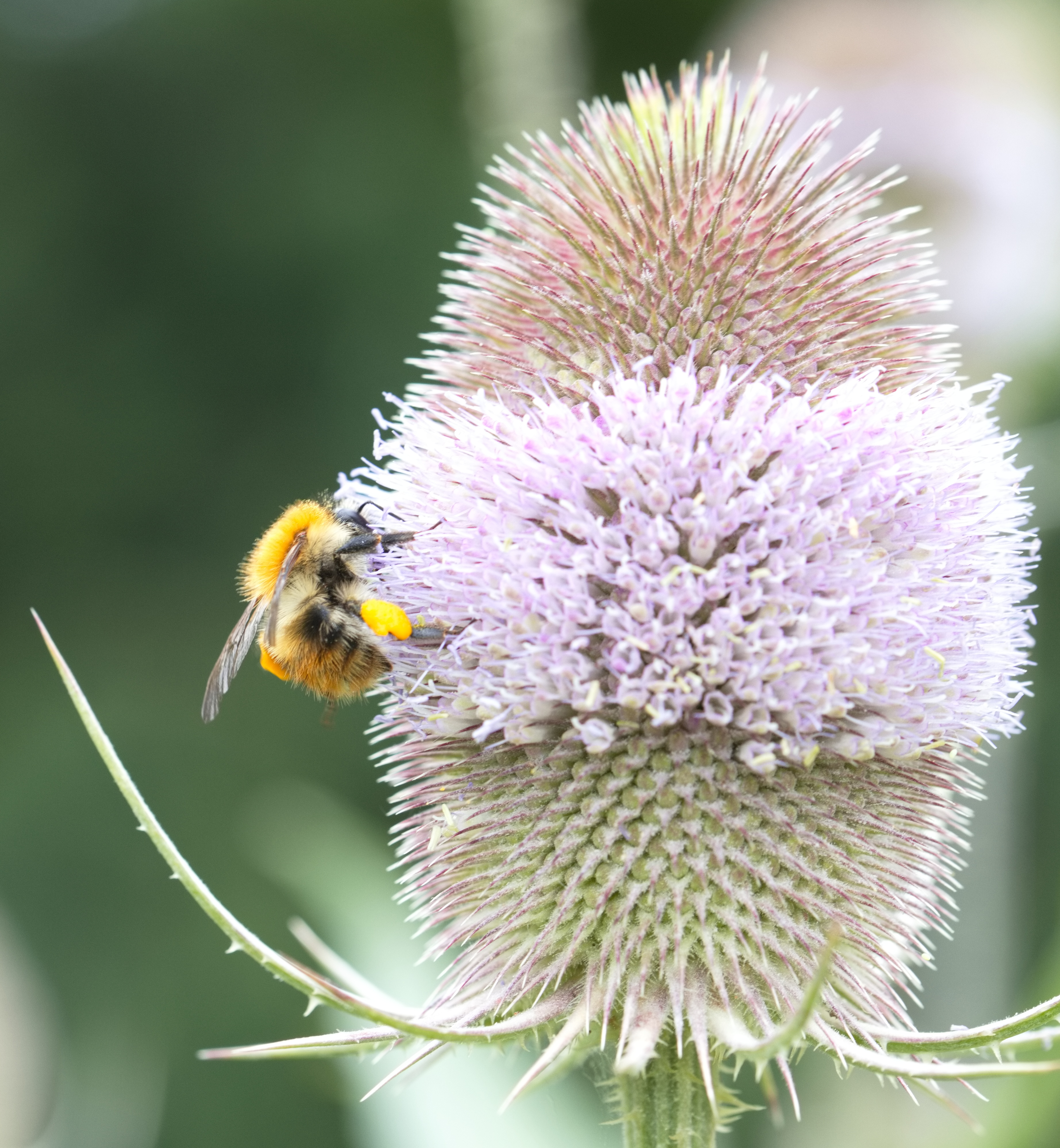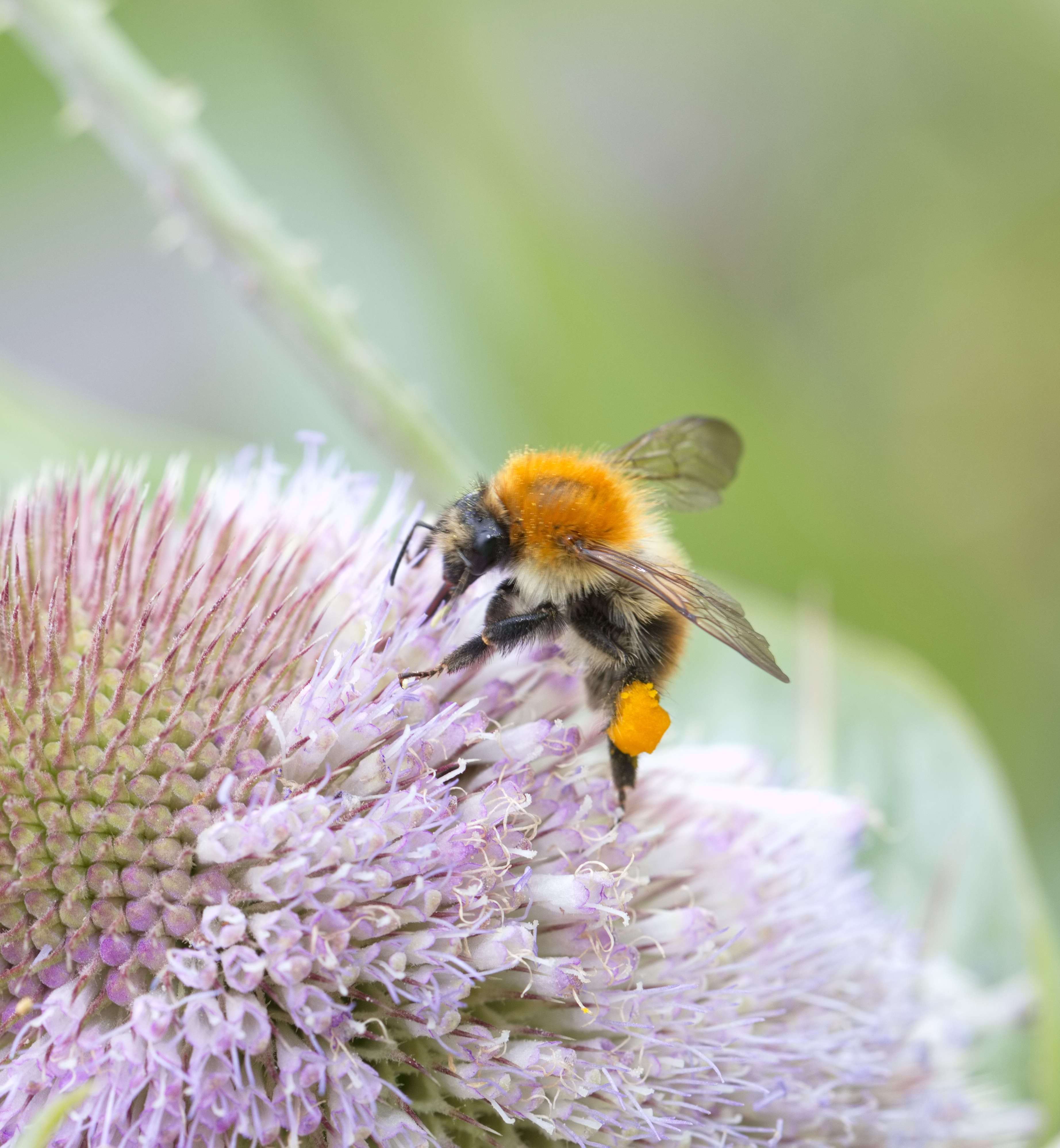 Ackerhummel (Bombus pascuorum) mit gefüllten Pollentaschena auf einer wilden Karde.