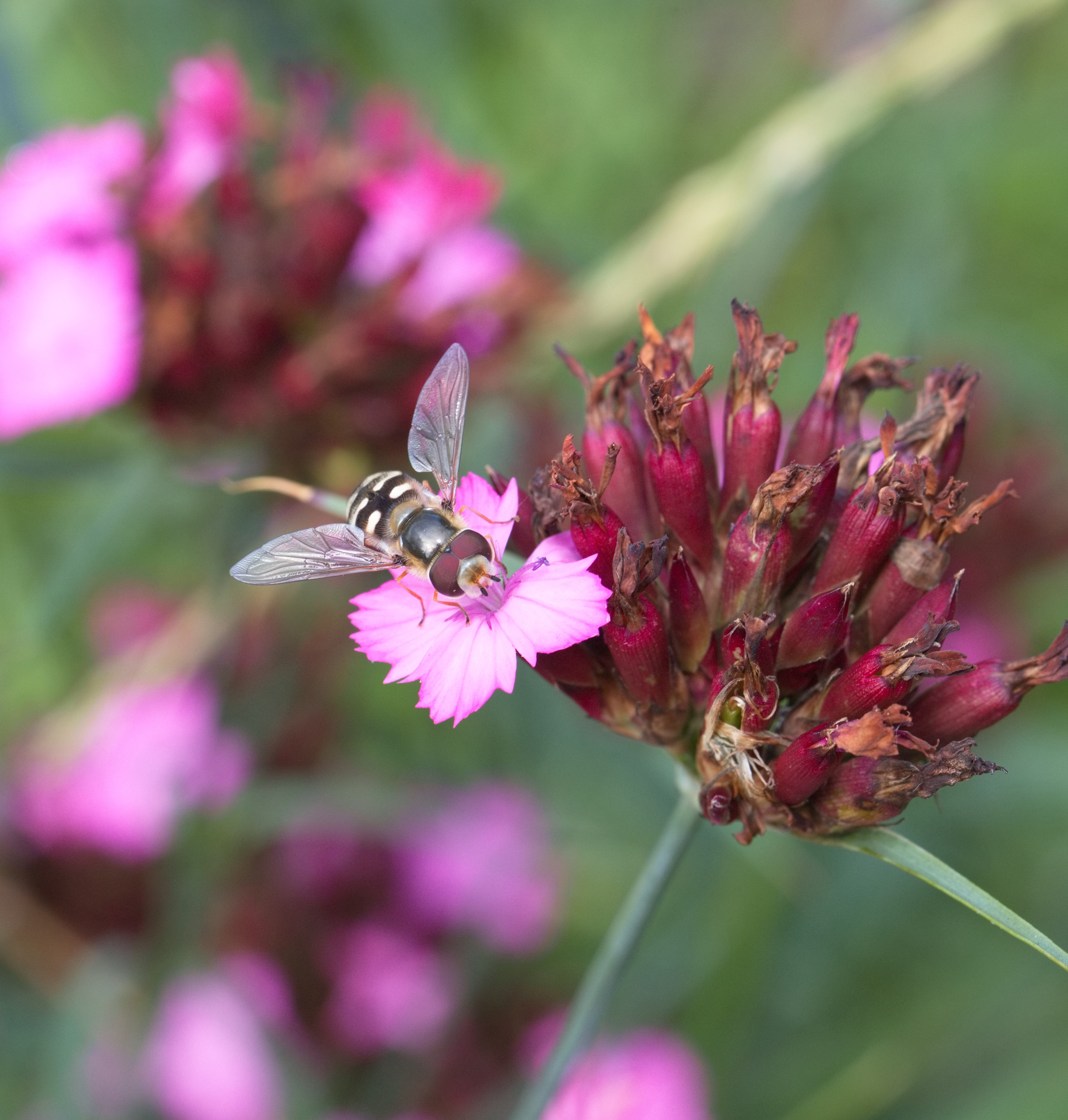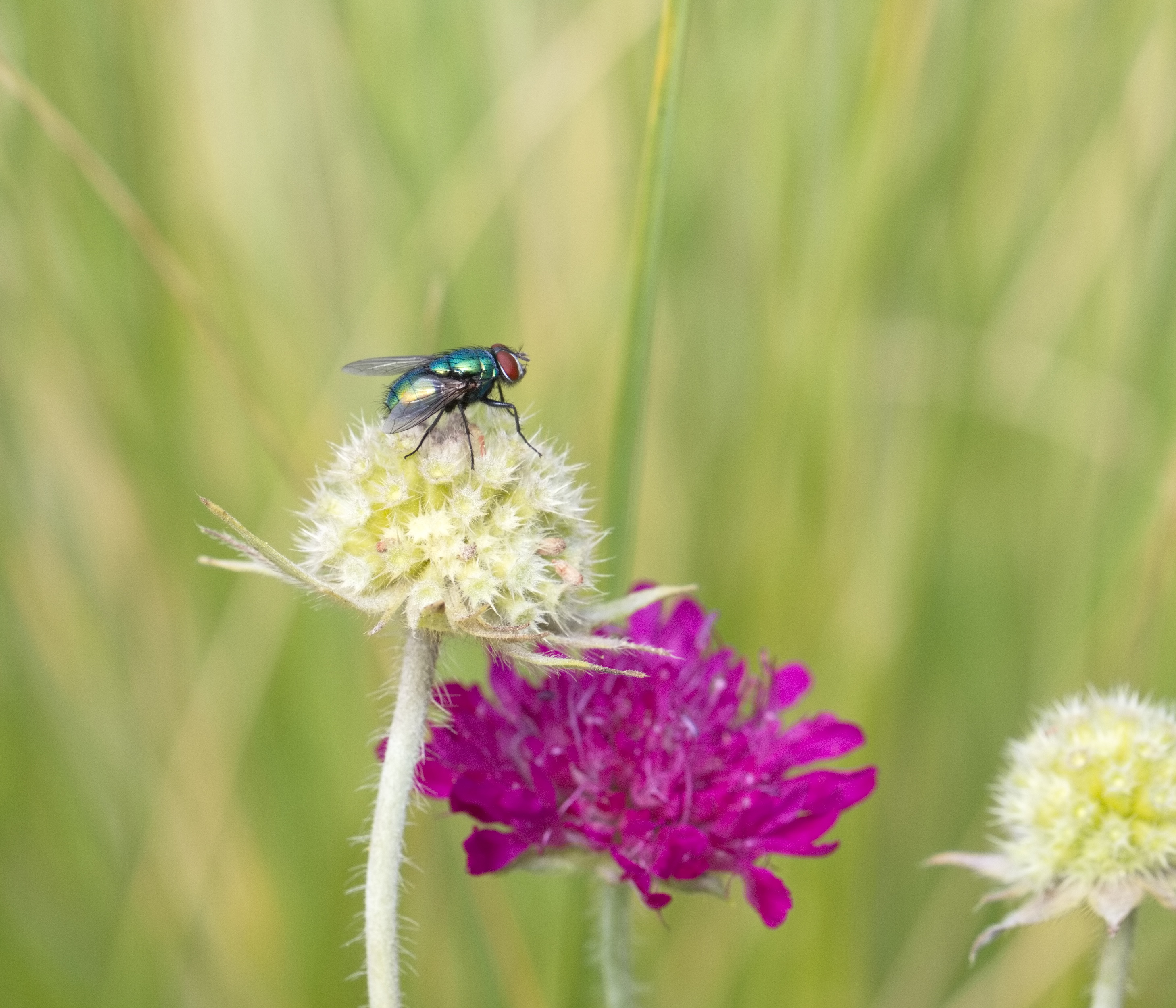 Grüne Schmeißfliege (Lucilla sericata) auf einer Witwenblume.