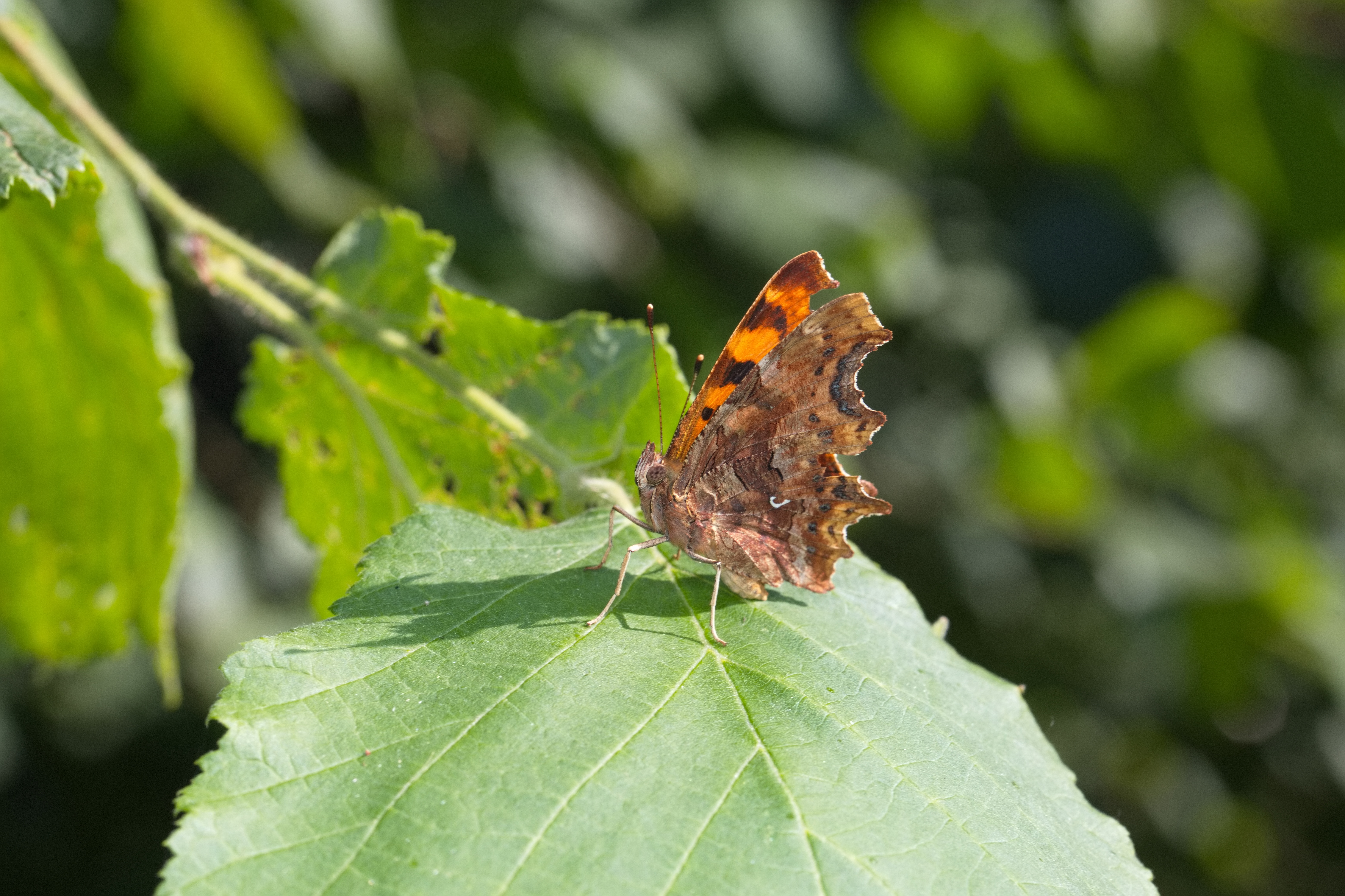 C-Falter (Polygonia c-album) auf einem Blatt.