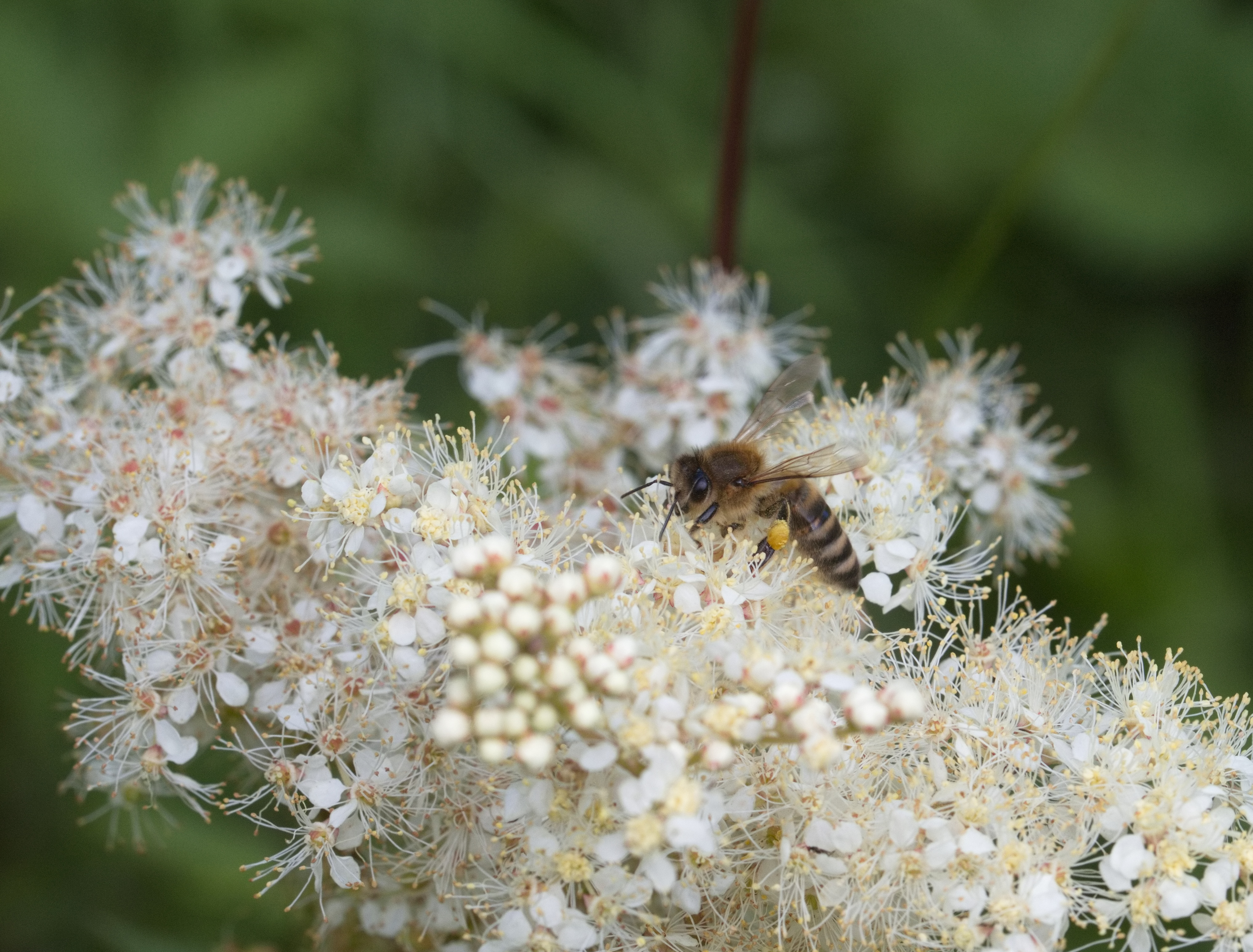 Westliche Honigbiene ((Apis mellifera) auf Echtem Mädesüß.