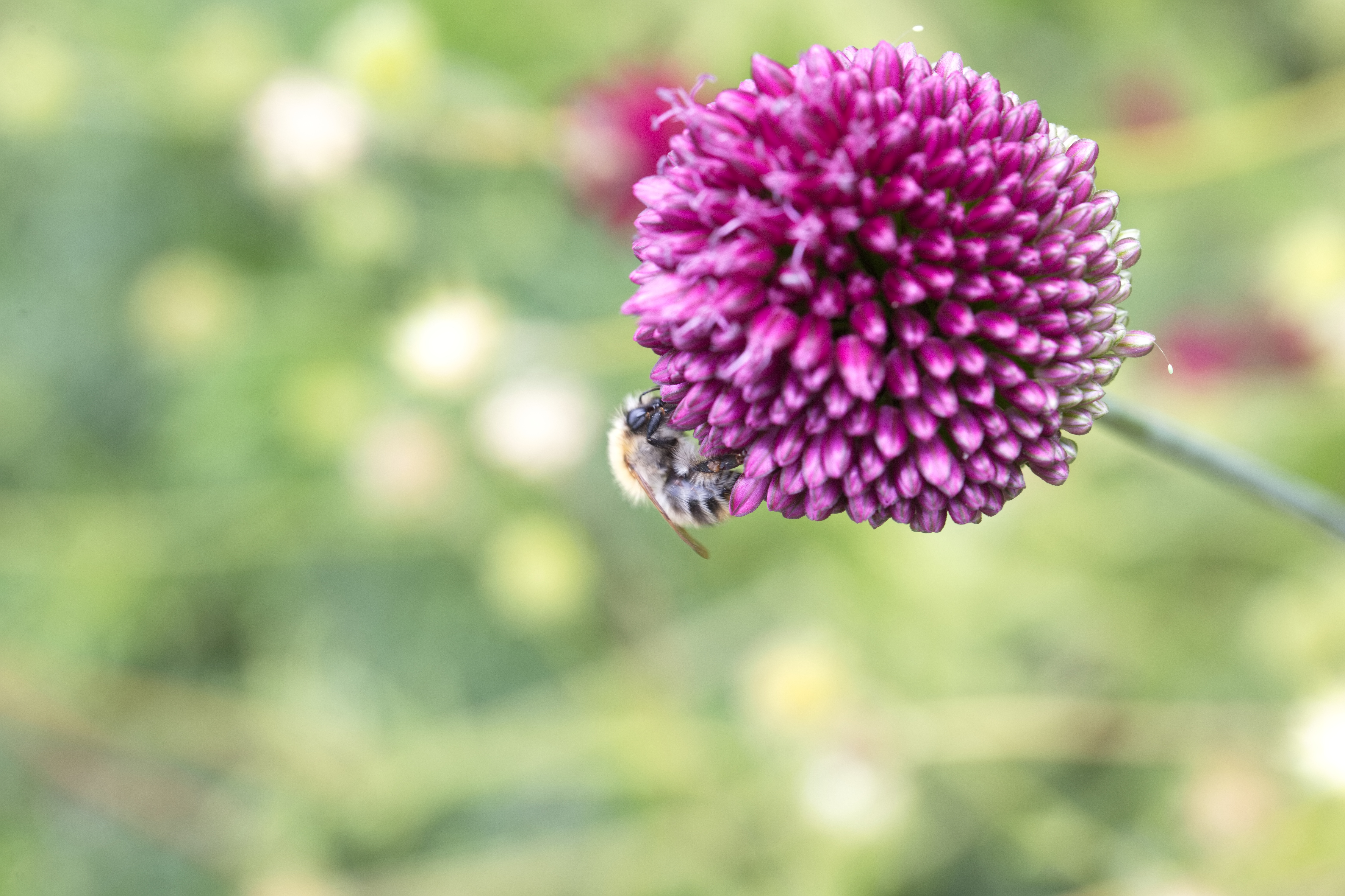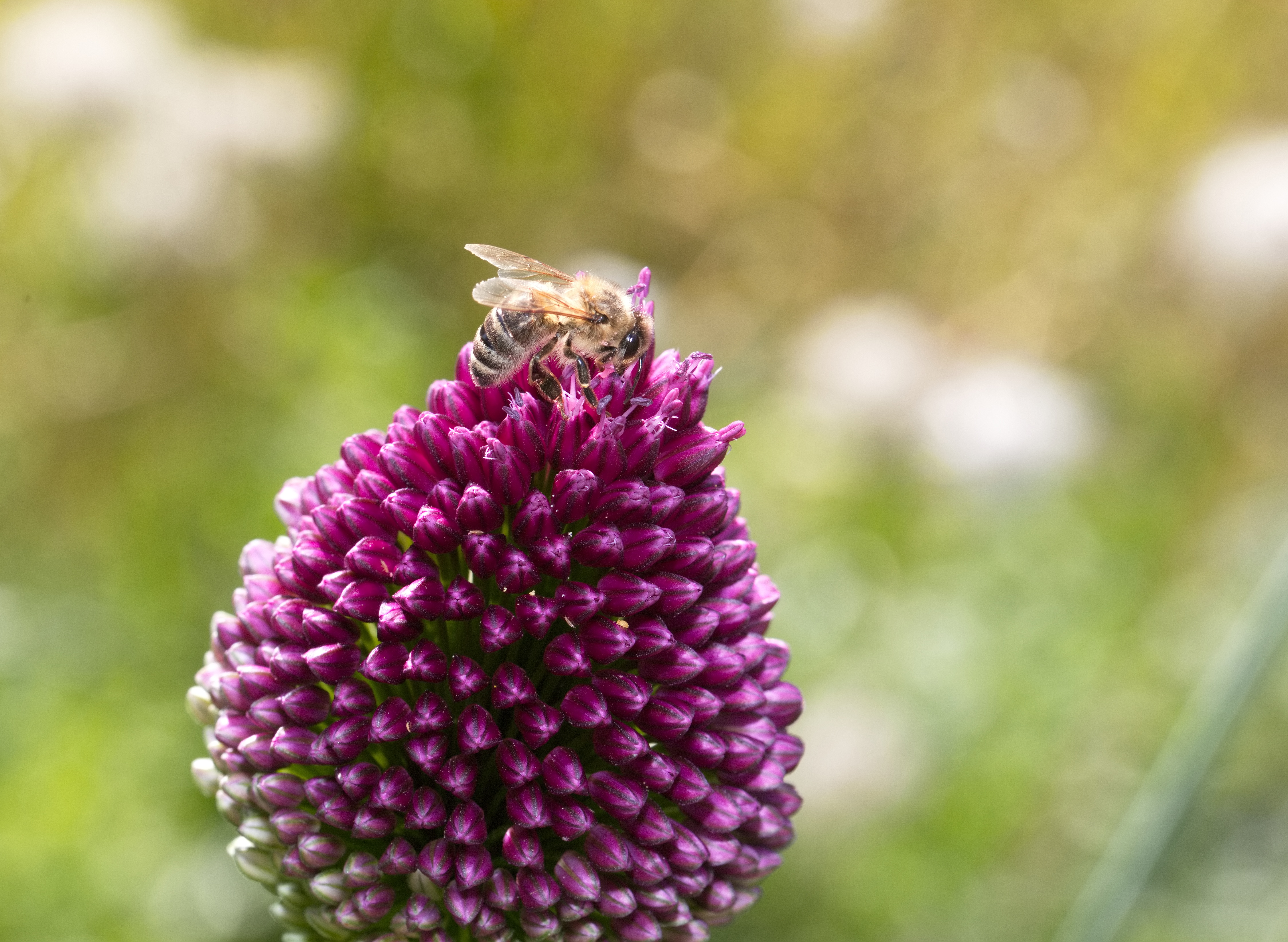 Westliche Honigbiene (Apis mellifera) auf der Blüte des Kugelförmigen Lauchs.
